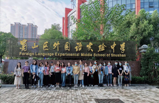 本网讯 9月18日,外国语学院2020级学科教学(英语)26名专业硕士研究生在班主任蒋道华老师的组织带领下,正式走入实践中学开展为期一学期的见习活动。这次见习活动主要安排在合肥两所优质中学:蜀山区外国语实验中学和合肥阳光中学。一大早,参加见习的同学们都怀着期待与喜悦的心情早早就集中在见习学校门口,等待与实践学校指导老师的见面。
