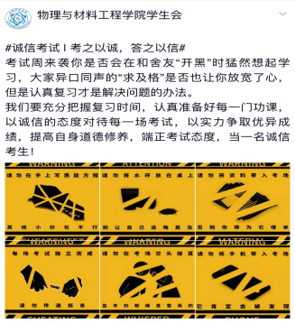此外,物材学院通过学生成长导师教育指导、学生党员干部榜样示范,从多角度、多层面向学生强调诚信考试的重要性,让学生更加明晰考试违规作弊所产生的严重后果,从思想根源上打消考试作弊的想法,对学生行为起到警示和约束作用。营造了优良考风、学风,有力保障了诚信法纪教育的有效开展。(物理与材料工程学院:韩翔)