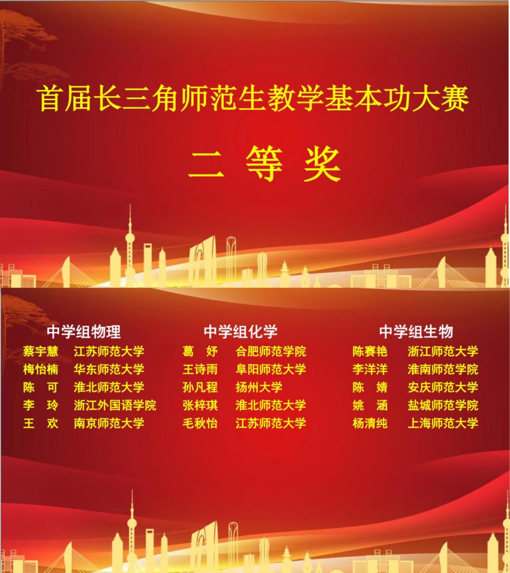 本次大赛充分发挥长三角高校在实施卓越教师培养中的引领和示范作用,旨在培养造就一批教育情怀深厚、专业基础扎实、勇于创新教学、善于综合育人和具有终身学习发展能力的高素质专业化新型基础教育师资。不仅为师范生提供了一个展示能力、互相学习交流的机会,也为各高校同仁提供了一个学术交流、增进友谊的平台。(化学与化学工程学院:王骏 姚娟娟)