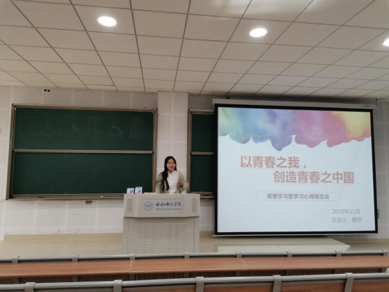 葛妤同学从集体观看习近平总书记在梁家河插队做知青的纪实视频引入,这段艰苦奋斗岁月,给同学们留下了深刻的印象。随后,葛妤从“活动聚集,青春学习”、“榜样力量,砥砺前行”、“蓬勃腾越,今日中国”、“青春之我,青春中国”四个方面向同学做系统介绍,以“是什么”,“来自哪里”,“做什么”三个方面对青春学习营的深刻意涵做出全面解释。