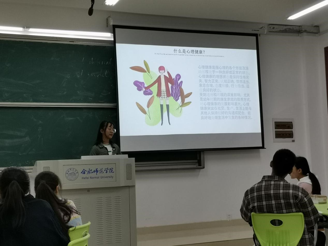 首先,心理委员向同学门讲述了什么是心理健康,通过文字语言描述了心理健康的本质意义,指出心理健康是指心理的各个方面及活动过程处于一种良好或正常的状态。随后,他们从学习、人际关系、恋爱、性格与情绪以及求职与择业等五个方面向同学们详细地介绍了五大常见的心理问题,引导同学们深入地认识与了解心理问题,做好提前防范。接着心理委员们从先前提出的五大常见心理问题入手,向同学们介绍了几种简单且有效的解决方法,增强了同学们对心理问题的防范意识,增进了同学们对心理健康与心理问题的了解。最后进行班会总结,对开展此次心理健康主题班会的意义进行陈述,再次强调了此次班会所讲述的重点内容,使同学们更加重视心理健康问题。