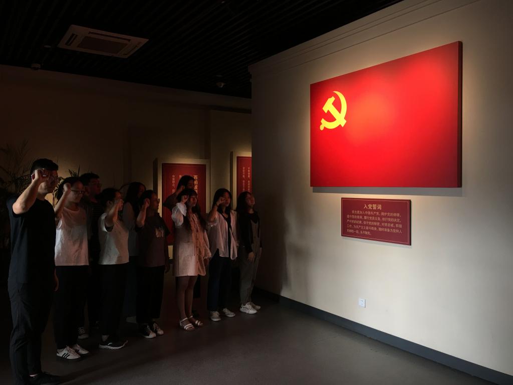 参观结束后,全体党员面对鲜红党旗,庄严举起右拳,以铿锵有力的声音向党旗宣誓:“我志愿加入中国共产党,拥护党的纲领,遵守党的章程,履行党员义务,执行党的决定,严守党的纪律,保守党的秘密,对党忠诚,积极工作,为共产主义奋斗终身,随时准备为党和人民牺牲一切,永不叛党!”在党旗的见证下,全体党员重温了自己对党忠诚的铮铮誓言,表达了“不忘初心、牢记使命”的信念和决心,参加本次主题教育实践的入党积极分子也深受鼓舞。