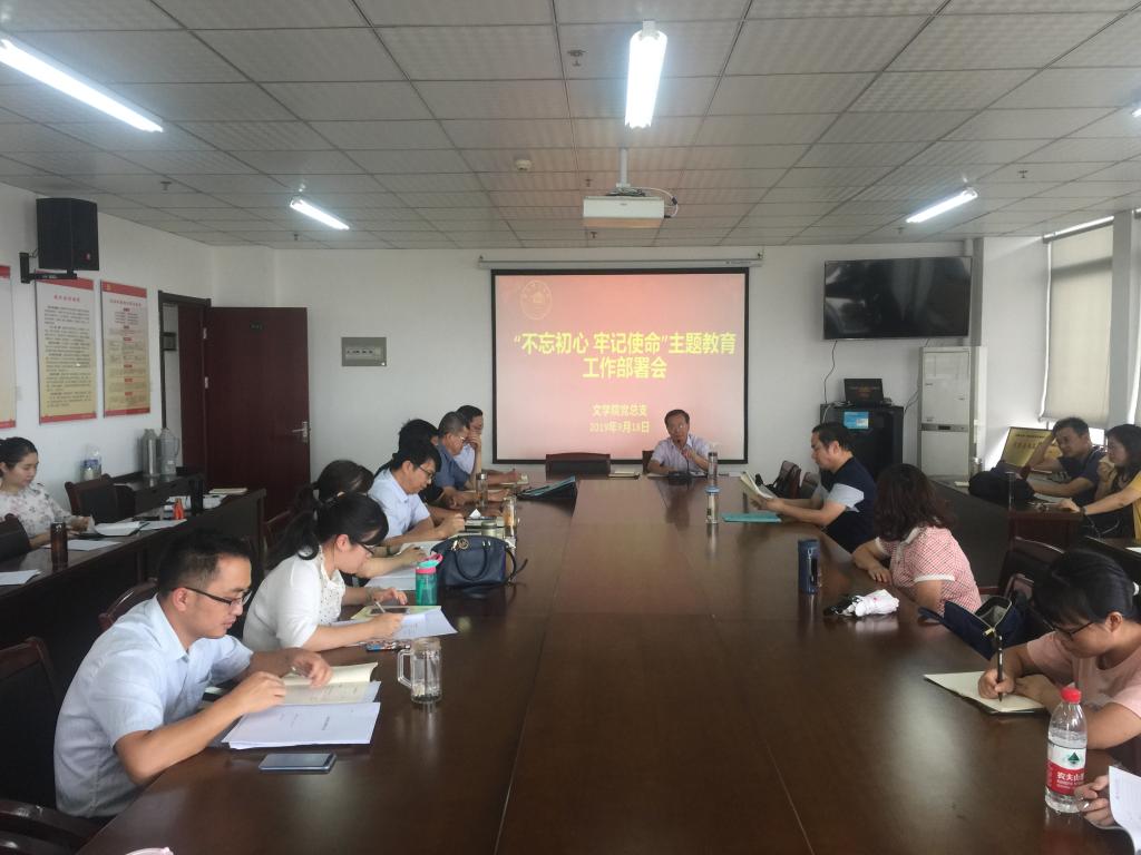 本网讯 9月18日下午,文学院在行知楼会议室召开“不忘初心、牢记使命”主题教育工作部署会,文学院全体教工党员和学生党支部委员参加会议,会议由党总支书记李旺生主持。
