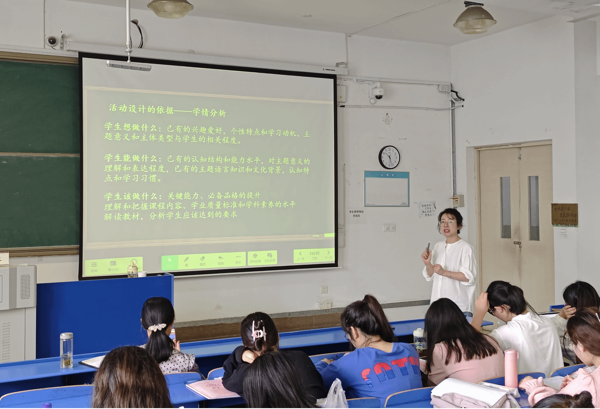 曹敏以《基于新课标的小学英语教学方法与艺术》为主题,围绕“新课标下的小学英语教学背景”“英语活动设计的理论与策略”“案例分析”三个部分进行分享。从英语教学总目标、教学内容和教学方式三个方面给大家提出了指导意见,鼓励师范生以核心素养为指引,进行主题意义探究,加强学科融合,促进学生全面发展。