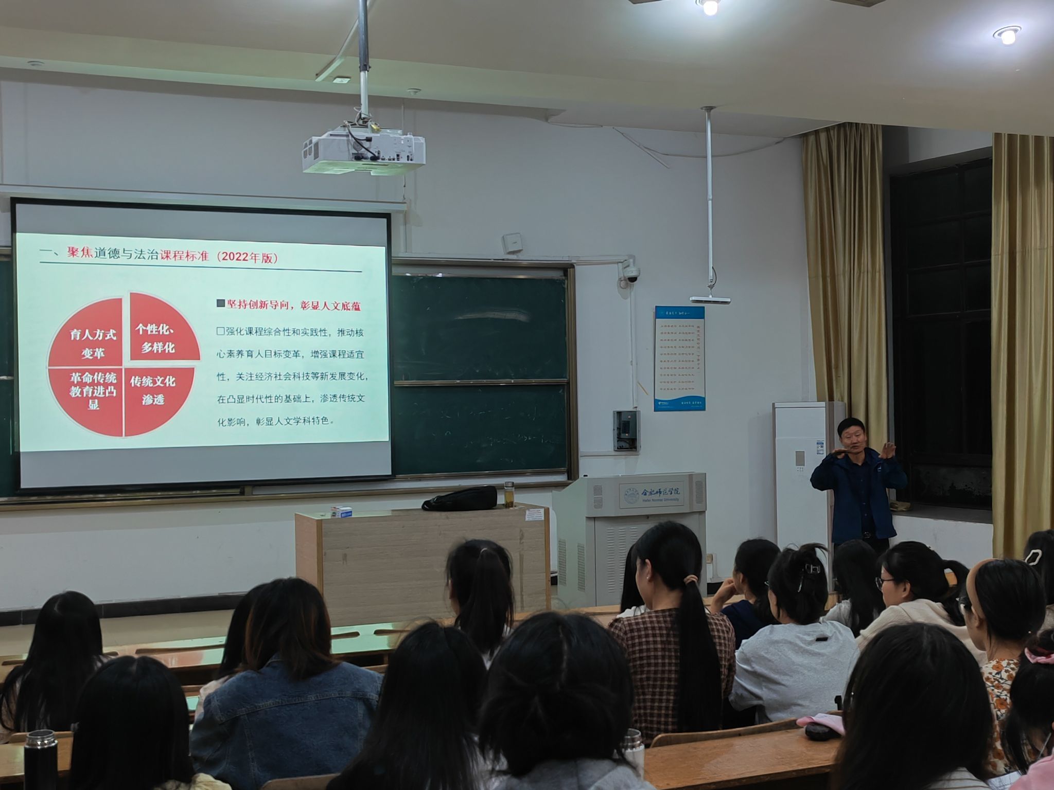 本次讲座,李加圣围绕“新课程标准下思政课课堂教学实施”主题,从“聚焦道德与法治课程标准(2022年版)”“关于道德与法治课程设计的常见问题”两个方面入手,聚焦义务教育道德与法治新课程实施以来教学实践中的五大热点问题——核心素养目标的撰写、服务教学的情境设计与优化、课堂设问的精准性、指向深度学习的“教学评”一致性、课堂教学实践中的学科融合方面,运用典型教学案例,事例结合,事理结合,动静结合,启发引导我院学生如何将新课程理念贯彻落实到教学实践中。学生听后深感专业学习思路更加开阔了,2022级学科教学(思政)班黄蔓玲表示“我听后,开始知道如何撰写核心素养教学目标了”;2022级思政班学委王远表示“李老师的讲座,让我们对2022年版课标有了新的了解,李老师通过对立德树人、创新导向和深度学习的教学设计和实施的解读,让我们明确了在以后的教学中要清楚教师教什么 、学生学什么和学到什么程度等,我们受益匪浅”;2022级思政班许诺同学表示“李主任聚焦2022年版道德与法治课程标准,通过典型课例《坚持国家利益至上——我爱这土地》,生动形象地展示了课堂教学实践中的学科融合,听完讲座,我不仅开拓了知识视野,而且锻炼和提升了作为师范生的反思和研究能力,受益颇多”;2023级学科教学(思政)班公冶繁荣表示“听完李主任的讲座,我醍醐灌顶。李主任运用丰富且典型的教学事例,引导我们思考和践行如何将新课程理念落实到教学实践之中,我感受要积极研读新课程标准,仔细品味思考核心素养落实的着力点,突出学生中心,全面锻炼和提高自己的教学本领,努力在未来的思政课岗位上熠熠生辉”。