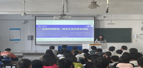 安徽安科生物工程(集团)股份有限公司基因药物工程研究中心副主任魏利承担《基因工程》一课。魏利以《抗体药物研发——纯化工艺开发及控制》为题,向大家讲授抗体药物的制备工艺。她首先阐述抗体药物是一种治疗疾病的新型药物,它可以从患者体内提取免疫细胞,并对之进行培养和扩增,然后将其回输到患者体内,从而发挥治疗作用。接着又从抗体药物制备工艺流程、抗体药物下游纯化工艺开发及控制加工,为同学们立体地展示了抗体药物的研发历程。