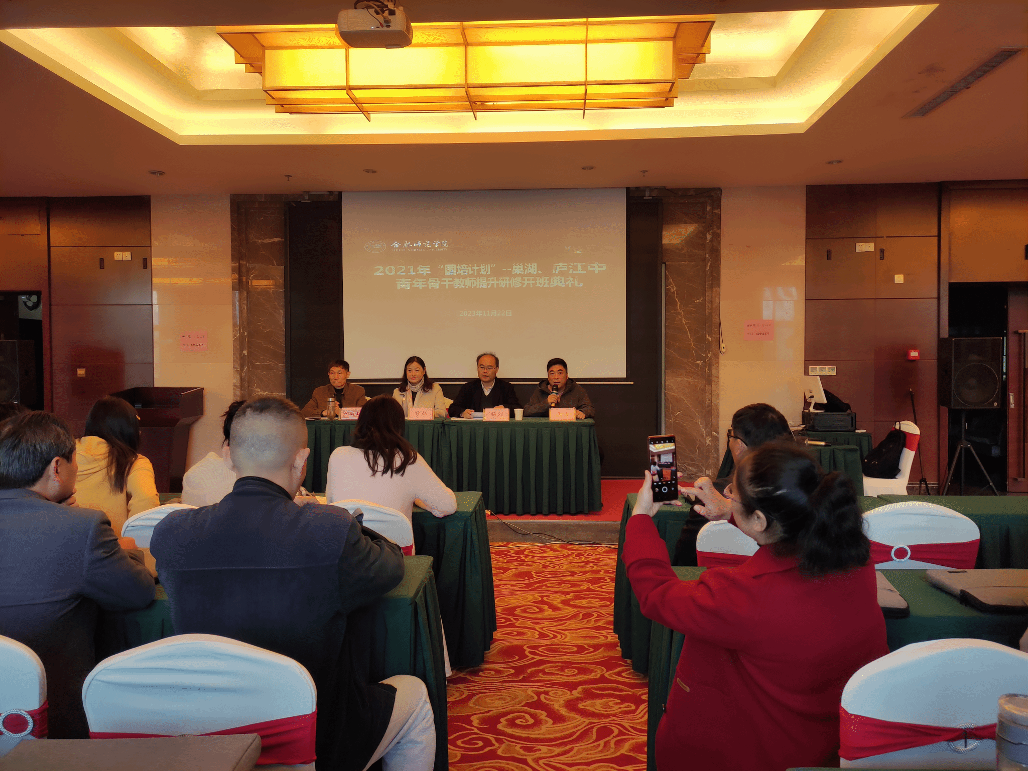 11月22日上午,由beat365唯一官方网站承办的巢湖市、庐江县2021年“国培计划”——中青年骨干教师提升研修(数学学科)2023年第三期集中培训班在天宫国际大酒店举行开班典礼,数学与统计学院党委书记穆娟、副院长杨刘、项目负责人沈南山和来自巢湖市、庐江县的全体参训学员出席了典礼,典礼由班主任王志主持。