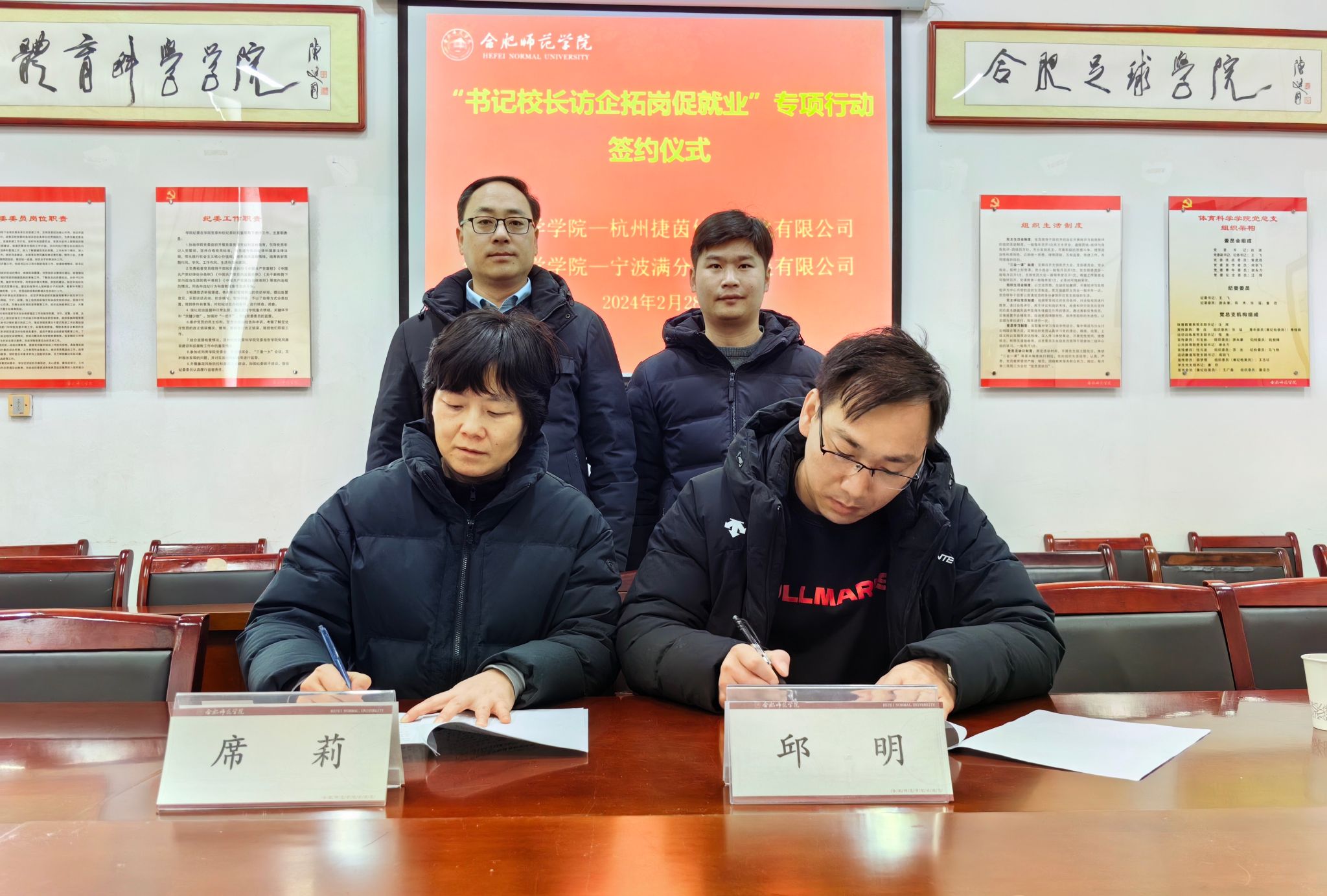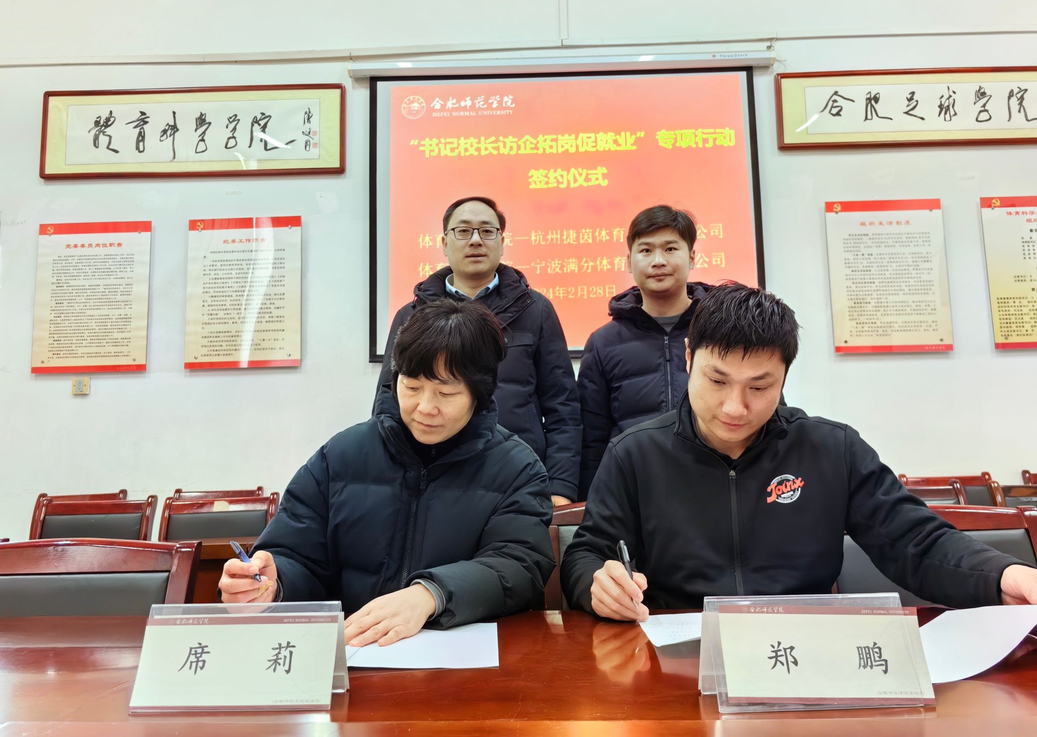 座谈会后,副院长席莉与杭州捷茵体育文化有限公司创始人郑鹏、宁波满分体育发展有限公司人力资源总监邱明共同签订毕业生就业实习基地协议。同时,赵波还分别与安徽合思达体育俱乐部有限公司、合肥梧山足球培训学校有限公司、安徽鑫空体育文化传播有限公司等3家企业相关负责人在共建毕业生就业实习基地、深化产学研合作、促进成果转化方面达成初步合作意向。