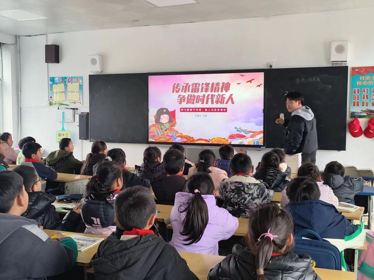 活动伊始,志愿者们生动地讲述了雷锋同志的生平事迹,小学生们聚精会神地聆听并积极参与互动。随后,志愿者教唱《学习雷锋好榜样》,并播放了《雷锋》《有风》等视频,小学生们积极踊跃,稚嫩的歌声与志愿者的领唱交织融合,谱出悠扬的乐章。在志愿者的带领下,小学生们一起参与绘制主题板报、清理校园,用文字展示永恒的雷锋精神,用行动续写新时代雷锋精神。