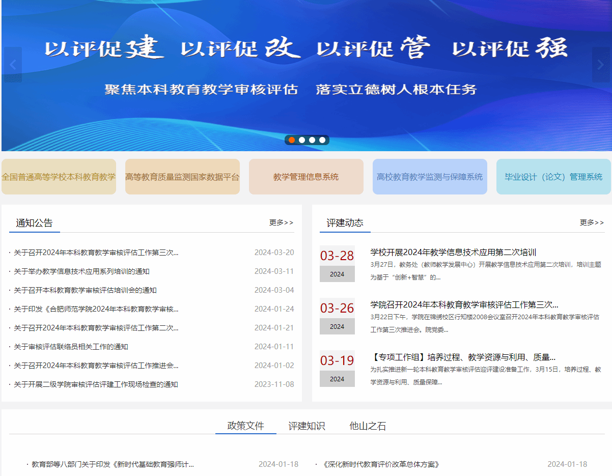 作为本科教育教学审核评估工作的专题网站,该网站开设了“学校概况”“通知公告”“评建动态”“政策文件”“评建知识”以及“他山之石”等6个栏目,集中展现学校本科教育教学成果和各单位积极开展本科教育教学审核评估迎评建设工作的动态及经验做法,为广大师生及时了解迎评建设工作情况和获取审核评估政策资讯提供了窗口和平台。