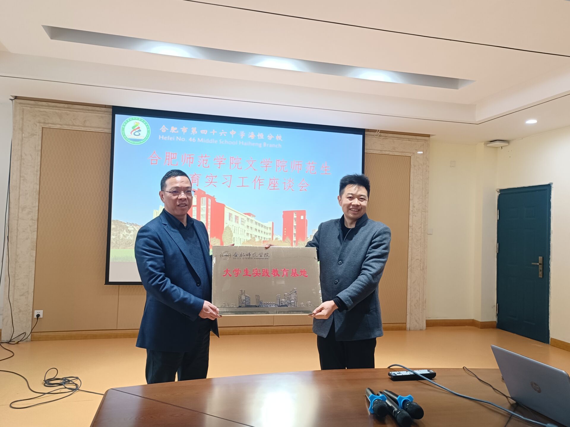 在合肥市四十六中学海恒分校召开实习生座谈会,该校副校长陈建林对文学院一行表示欢迎,并介绍了实习工作安排。文学院实习生分享了近期实习体会与收获,实习导师对师范生的实习情况作了交流,充分肯定了实习生踏实肯干的工作态度、良好的精神面貌和综合素质。双方就共建师范生实践教育基地进行签约并举行挂牌仪式。