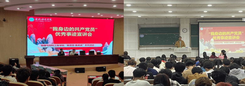 为充分发挥党员示范作用,讲好身边党员故事,4月1日晚,物理与材料工程学院各学生党支部在滨湖校区铭传楼学术报告厅和D101教室分别召开“我身边的优秀党员”优秀事迹宣讲活动。2023级全体学生参加会议,宣讲活动分别由学生支部书记韩翔、费文清主持。