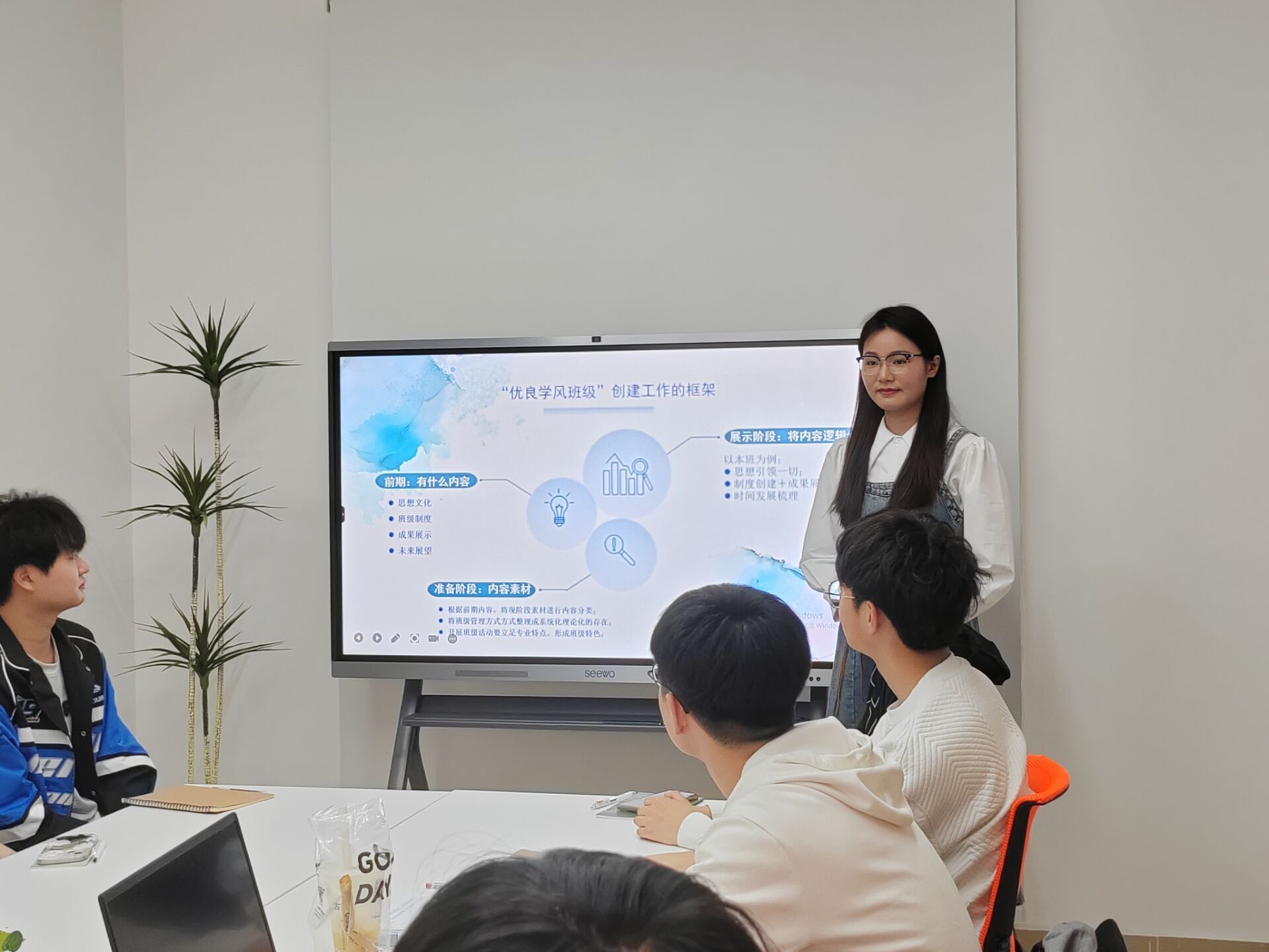 各班负责人通过PPT回顾了本班过去一年在思想建设、学风介绍、班级文化、实践锻炼等方面的工作成果,并分享了各自的班级工作经验和心得体会。2023级汉语言文学(师范)1班将理论与实践的相结合,并且经常在班级活动的实践中检验并且改良班级管理的方式;2023级汉语言文学(师范)2班结合专业特色开展各项实践活动,班级成员积极参与各种班级活动,在“合肥马拉松”“安博花朝节”和“行知学堂”等志愿服务活动中都有着很多班级成员的身影;2023级网络与新媒体1班强调班级的凝聚力,班级内部成立了互助小组,积极应对面临的困难;2023级网络与新媒体2班注重宿舍问题,班级里不仅宿舍关系和谐,而且宿舍卫生干净,环境整洁;2023级汉语言国际教育班级强调班级的学风的建设,管理制度条理清晰,班级学风自律向上。