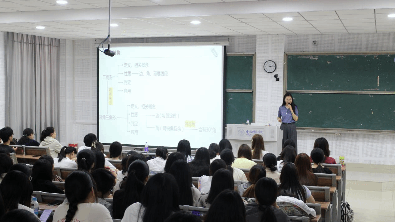 刘清清首先结合自己丰富的一线教学经历和教学竞赛经验,从《义务教育数学课程标准》(2022版)入手,围绕备课标、备教材、备学情、备教师、备教法学法等多个角度分享了如何备好一节课以及如何进行教学设计。随后,她为学生们上了一堂题为“锐角的三角函数”的精彩示范课。这堂课以巧妙的情境引入、亲切的语言表达、流畅的教学过程、精妙的教学设计以及整洁美观的板书,赢得了在场师生们的一致赞誉。