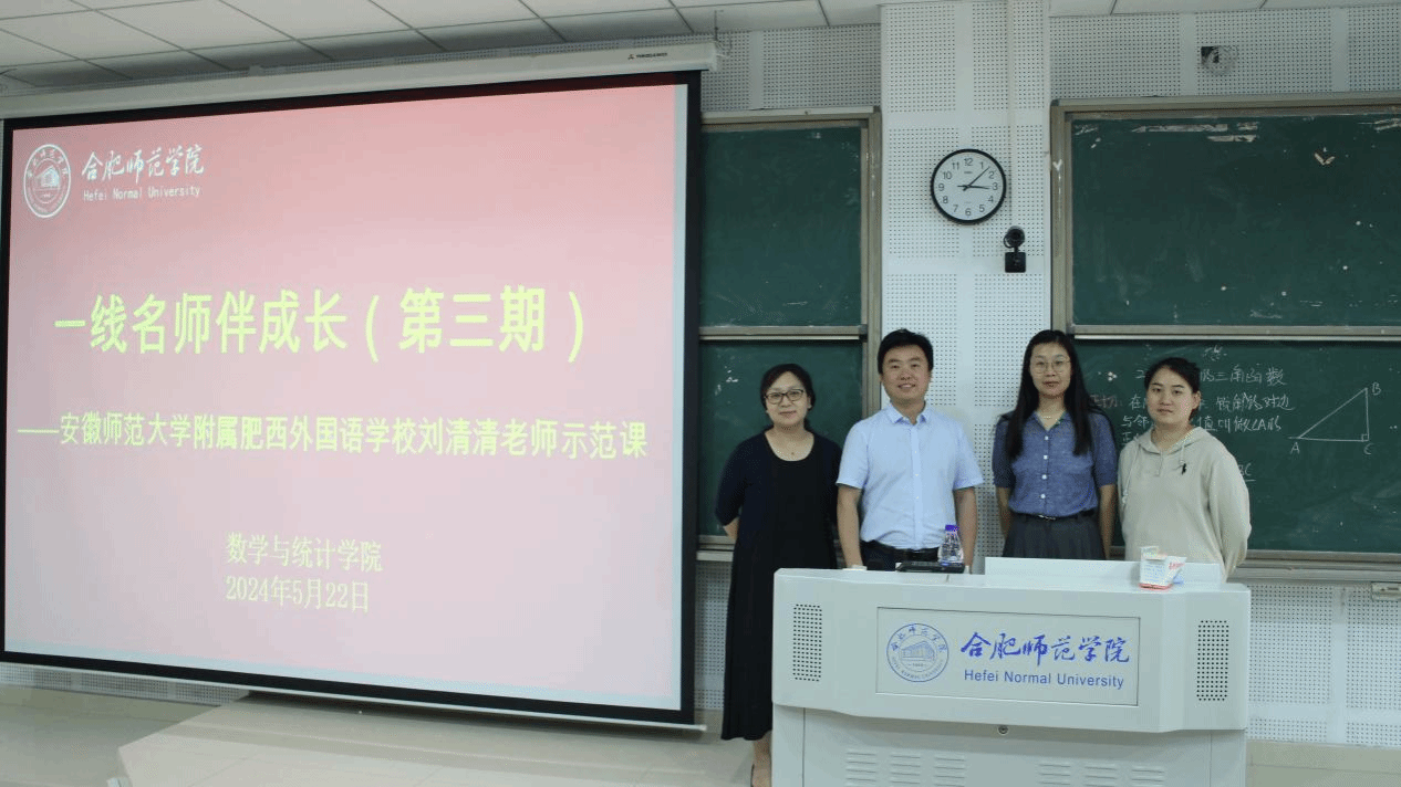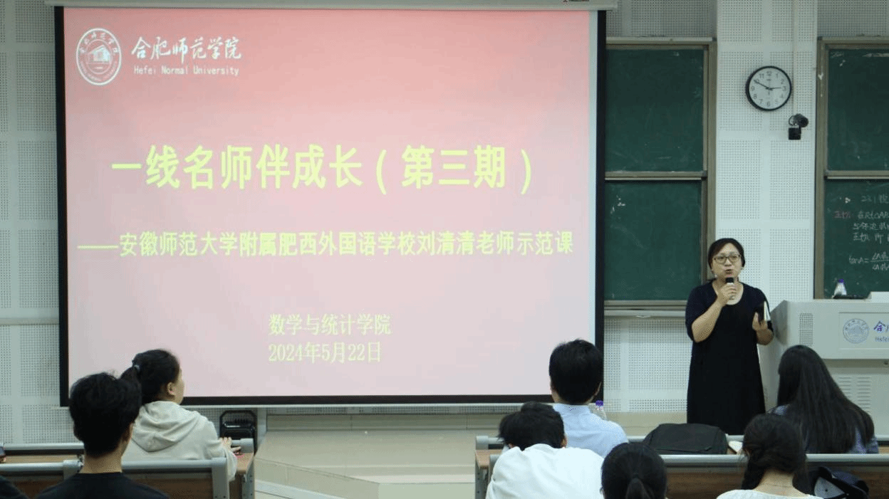 为落实“学生中心”理念,提升数学师范生教学技能,做好省级、校级师范生教学技能竞赛赛前辅导,5月22日下午,数学与统计学院在滨湖校区博学楼A108教室举办了“一线名师伴成长”第三期活动。此次活动邀请了合肥市金牌职工、合肥市教坛新星、合肥市优质课一等奖获得者、肥西县初中数学名师工作室领衔人、安徽师范大学附属肥西外国语学校的刘清清老师为数学专业师范生上了一堂初中数学示范课,并做了师范生教学技能辅导讲座。数学与统计学院副院长黄浩、数学课程与教学论教师栾庆芳、辅导员刘全亚,2022级、2023级共278位数学与应用数学(师范)专业的学生参加了本次活动,活动由副院长黄浩主持。