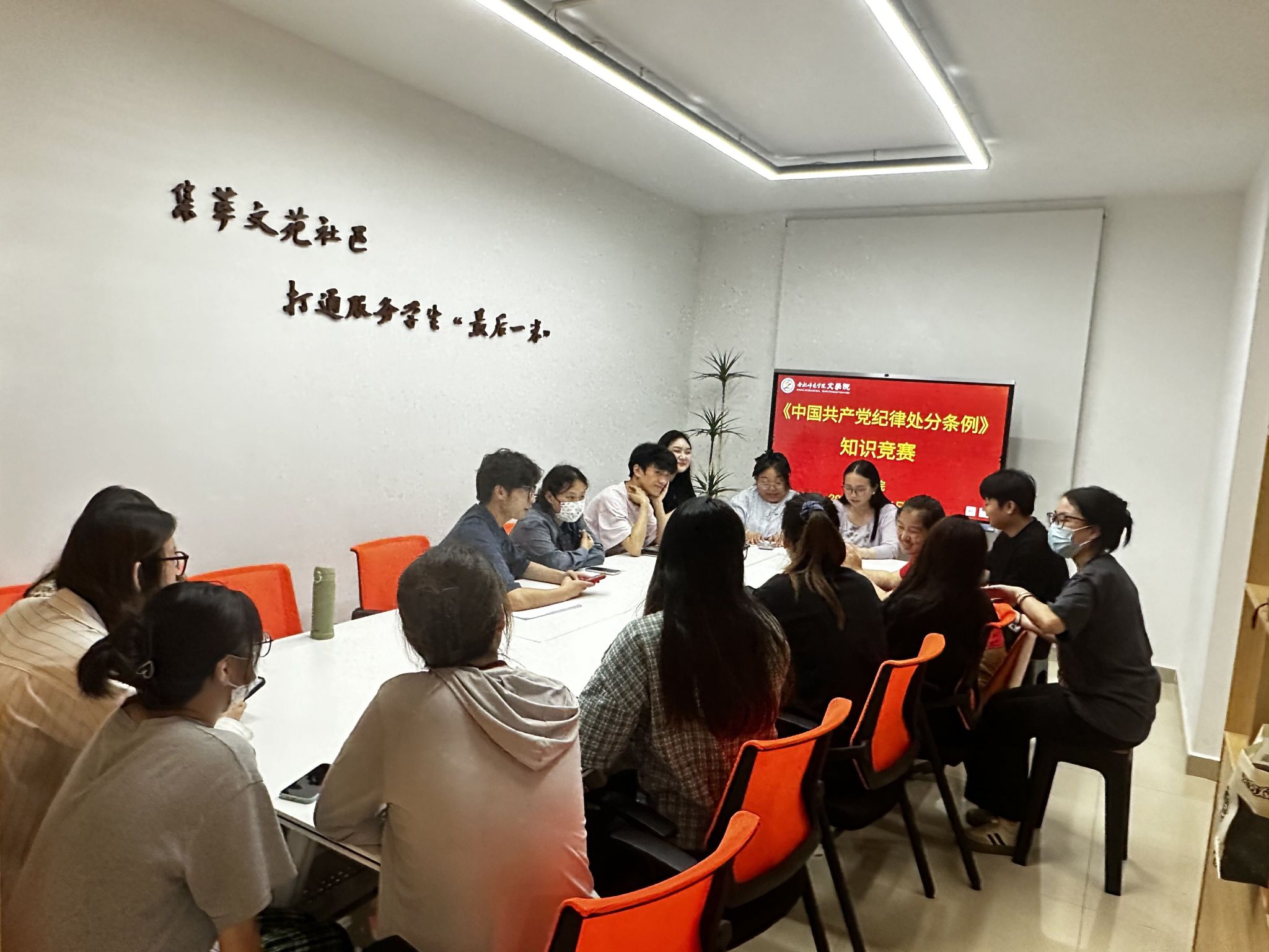 为扎实开展好党纪学习教育,加强学生党员对《中国共产党纪律处分条例》的学习和理解,引导和帮助学生党员提高党内纪律意识,5月26日晚,文学院学生第四党支部在集萃文苑社区组织开展《中国共产党纪律处分条例》知识竞赛的主题党日活动。