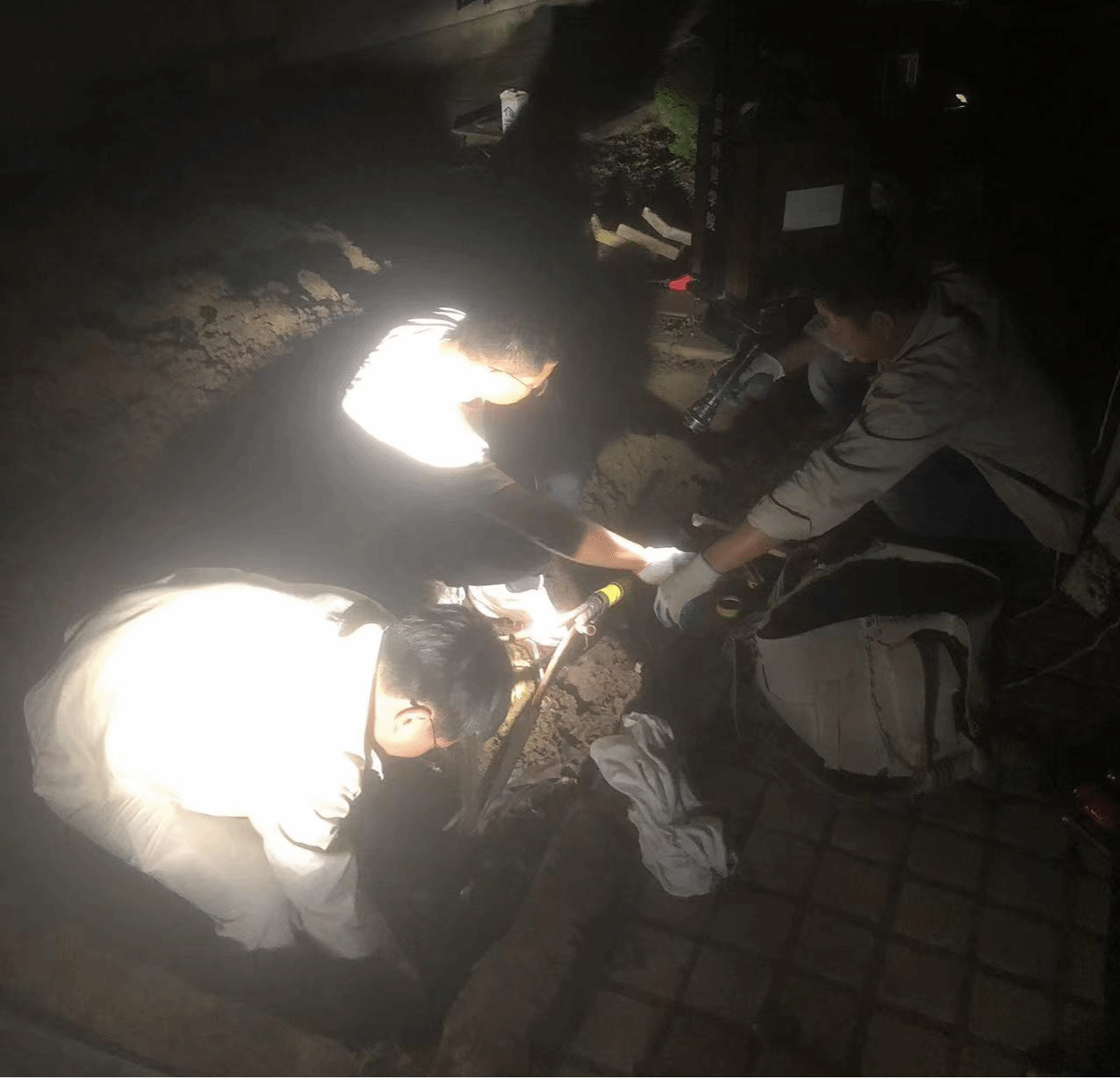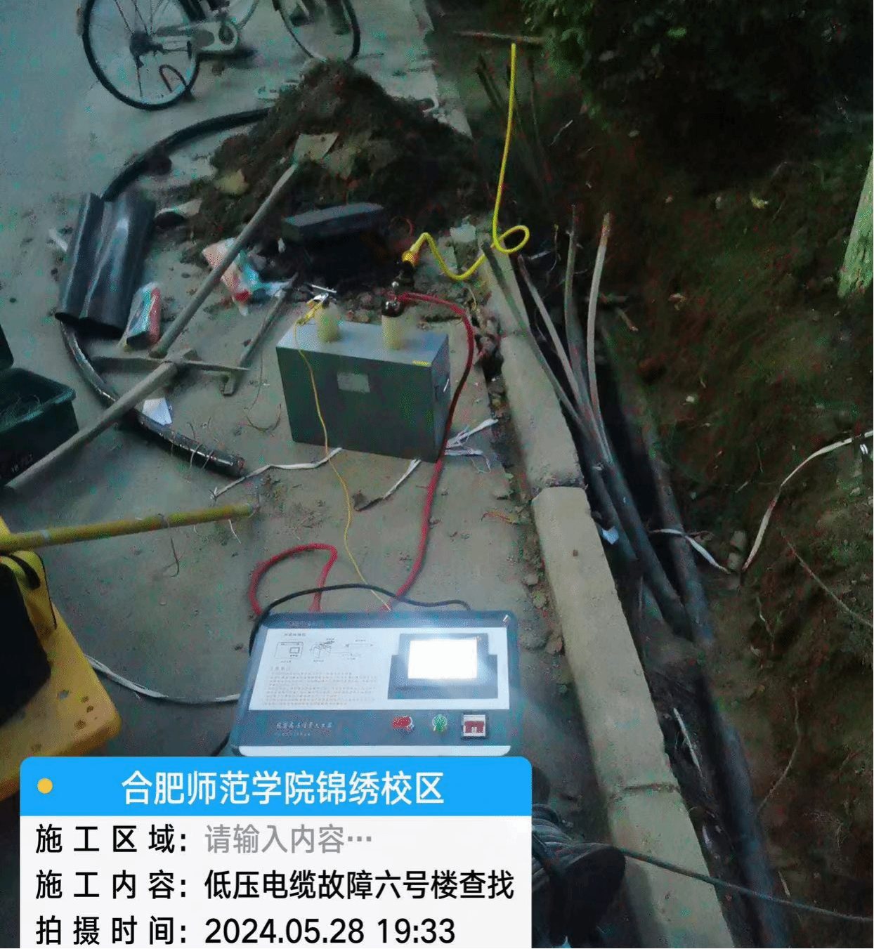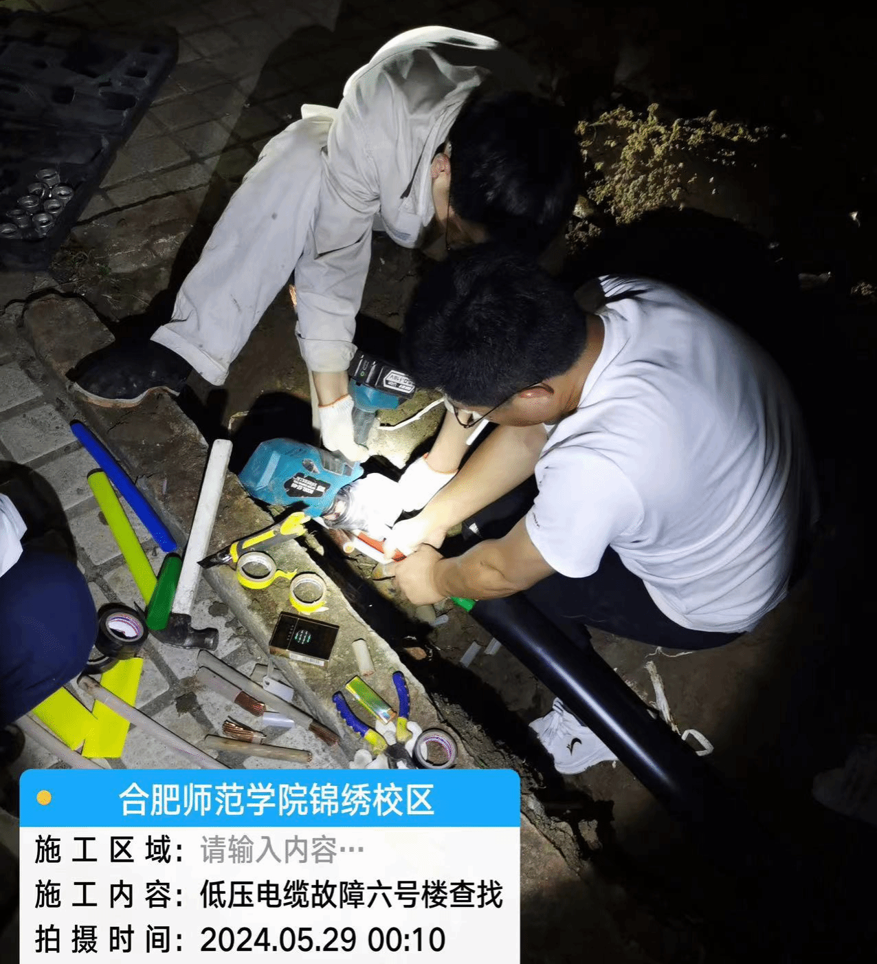 期间,水电班组和维保单位工作人员克服大雨等困难,从5月27日开始,对于电缆线路进行了逐段排查,连续通过多次的耐压实验和线路检测,分别于28号下午1点和28号晚21点30分,确定了发生故障的在6号公寓安全出口处和9号公寓东南角两处断点。