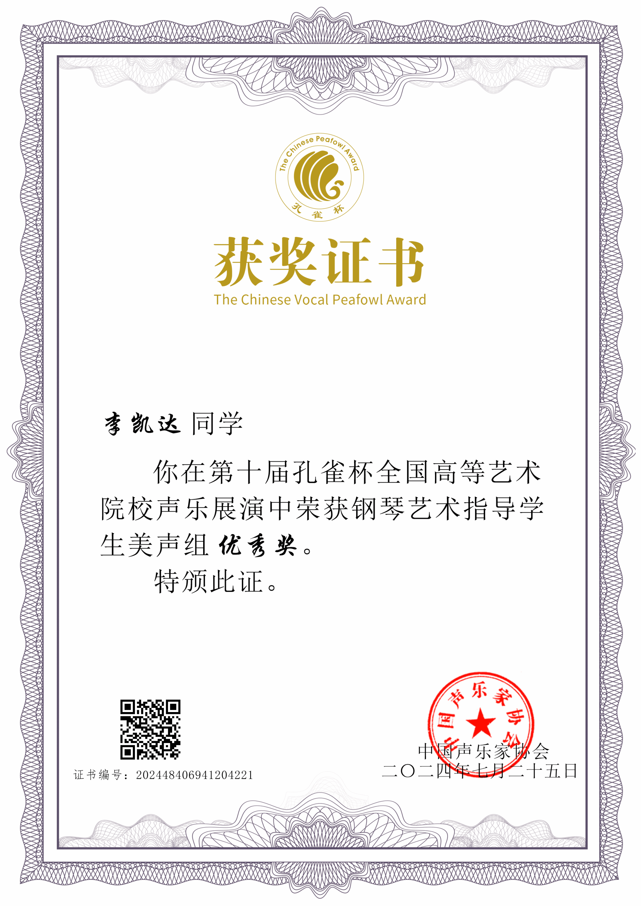 7月25日,由中国声乐家协会主办、华南师范大学承办的第十届孔雀杯高等艺术院校声乐展演圆满落幕。在这场音乐盛宴中,经过激烈的角逐,音乐学院叶蕾教师指导的2023级学生李凯达,在2022级声乐学生蒋依宁的协助下,脱颖而出,荣获钢琴艺术指导学生美声组优秀奖。