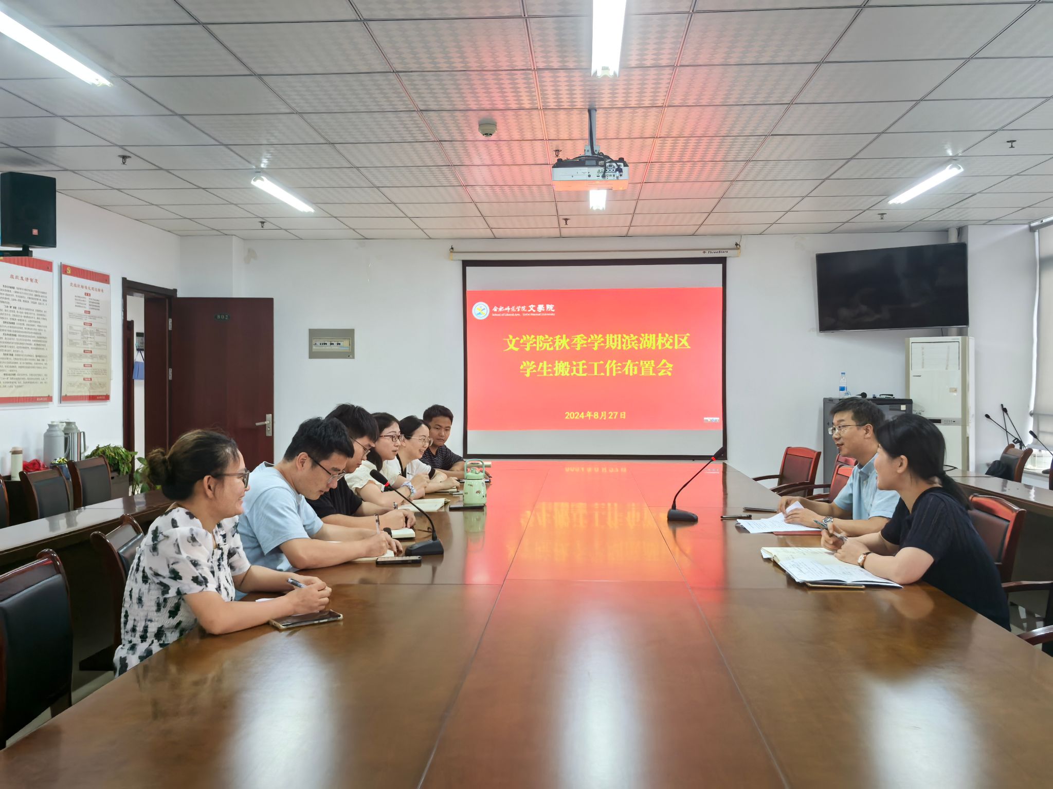 为做好动员、接待工作,29日-30日,院领导许锃、夏娟带领学院辅导员深入锦绣校区学生宿舍,查看宿舍环境、设施情况、水电安全,提前排查安全隐患,打开门窗通风,为即将搬迁的学生做好准备。辅导员分别在滨湖校区召开主题班会,作搬迁动员,详细介绍学院搬迁工作安排和具体举措,叮嘱学生行李打包搬运等安全注意事项,树牢安全意识,做到安全搬迁,文明搬迁。