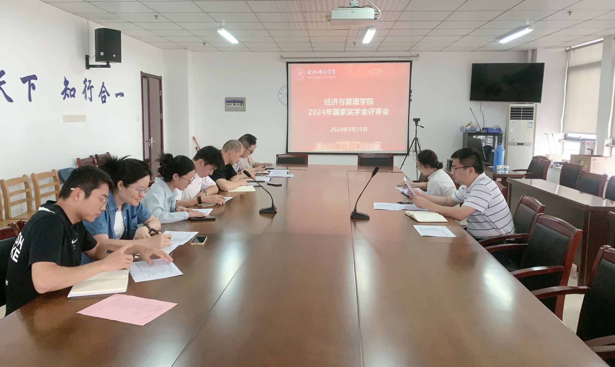 为切实做好2023-2024学年国家奖学金的评审工作,激励学生勤奋学习、努力进取,在德智体美劳等方面得到全面发展,坚持公开、公平、公正、择优的原则,经济与管理学院于9月19日下午举行2024年本科生国家奖学金评审会。学院党委书记陈好、副书记陶敏,教师代表刘经涛、许凤妹,辅导员曹国志、蒋诗伟、王瑞瑞及学生代表韩劲松、张瑾共同参与此次评审。