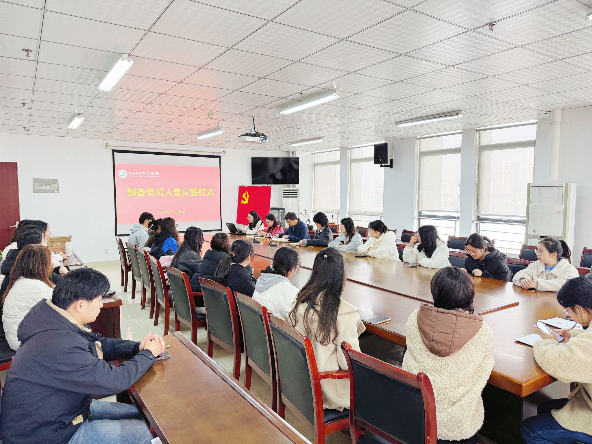 为了进一步增强新党员入党荣誉感,12月5日,文学院在行知楼802室举行2024年下半年新党员入党宣誓仪式。学院党委书记许锃、党委副书记夏娟、学生第二党支部书记曹甜甜,25名新党员参加此次宣誓仪式。宣誓仪式由组织员疏淑进主持。