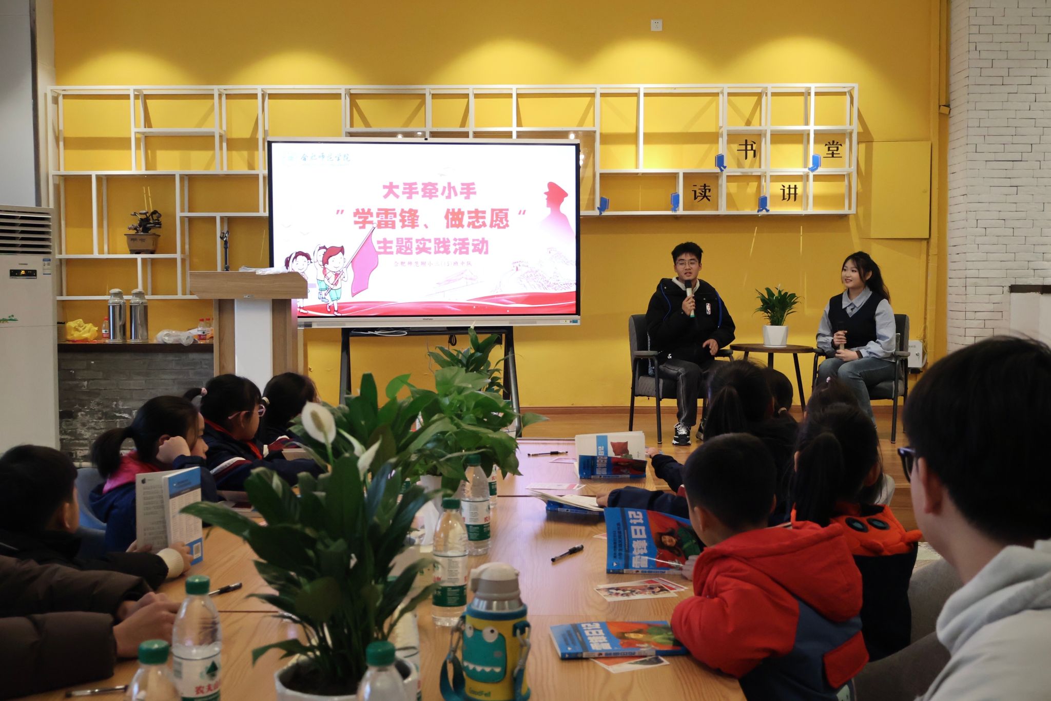 根据学院第七届弘扬社会主义核心价值观活动月暨2025年学雷锋活动安排,3月9日下午,院团委、学生社团文化服务中心联合合肥师范附小三年级中队,在锦绣校区举行党团队一体化“学雷锋、树新风”主题实践活动,学生党员、共青团员与少先队员们一起,用“大手牵小手”的方式,学习、践行、弘扬雷锋精神。