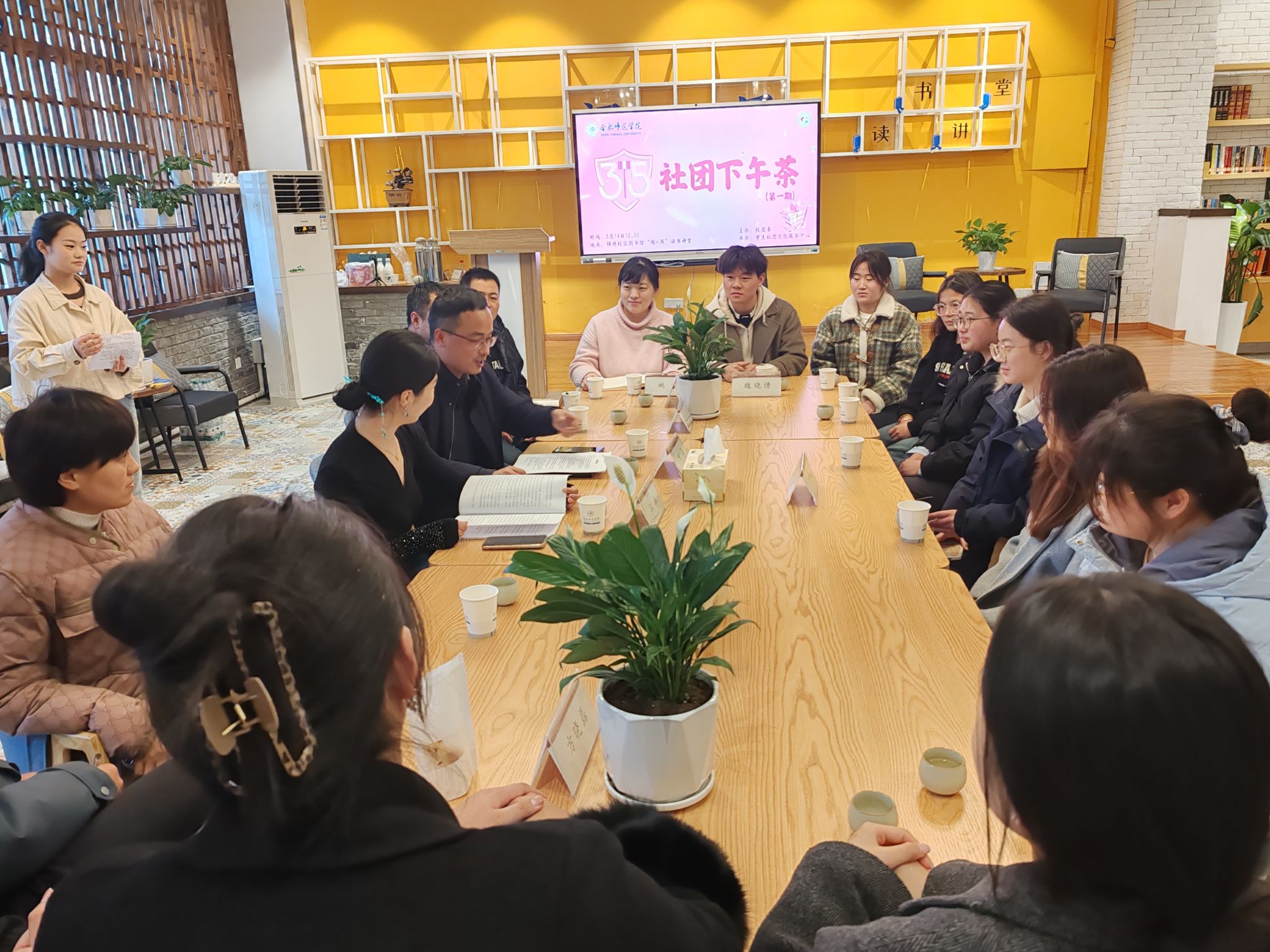 在“3·15”消费者权益日到来之际,为积极维护学生社团会员权益,了解学生社团意见建议,强化学生社团育人功能,3月14日下午,院团委、学生社团文化服务中心在锦绣校区图书馆“阅+历”读书讲堂举办第一期社团下午茶活动。Baker美食社指导老师陈倩颖,景行话剧社和学生青轻行走朗诵社指导老师江楠,梨花雨读书社指导老师杨焕昌,劳动教育研习社指导老师方晓磊,迷彩合师协会指导老师孟庆、徐占占,院团委副书记何磊,院团委姚瑶、魏晓倩以及学生社团成员代表参加活动。