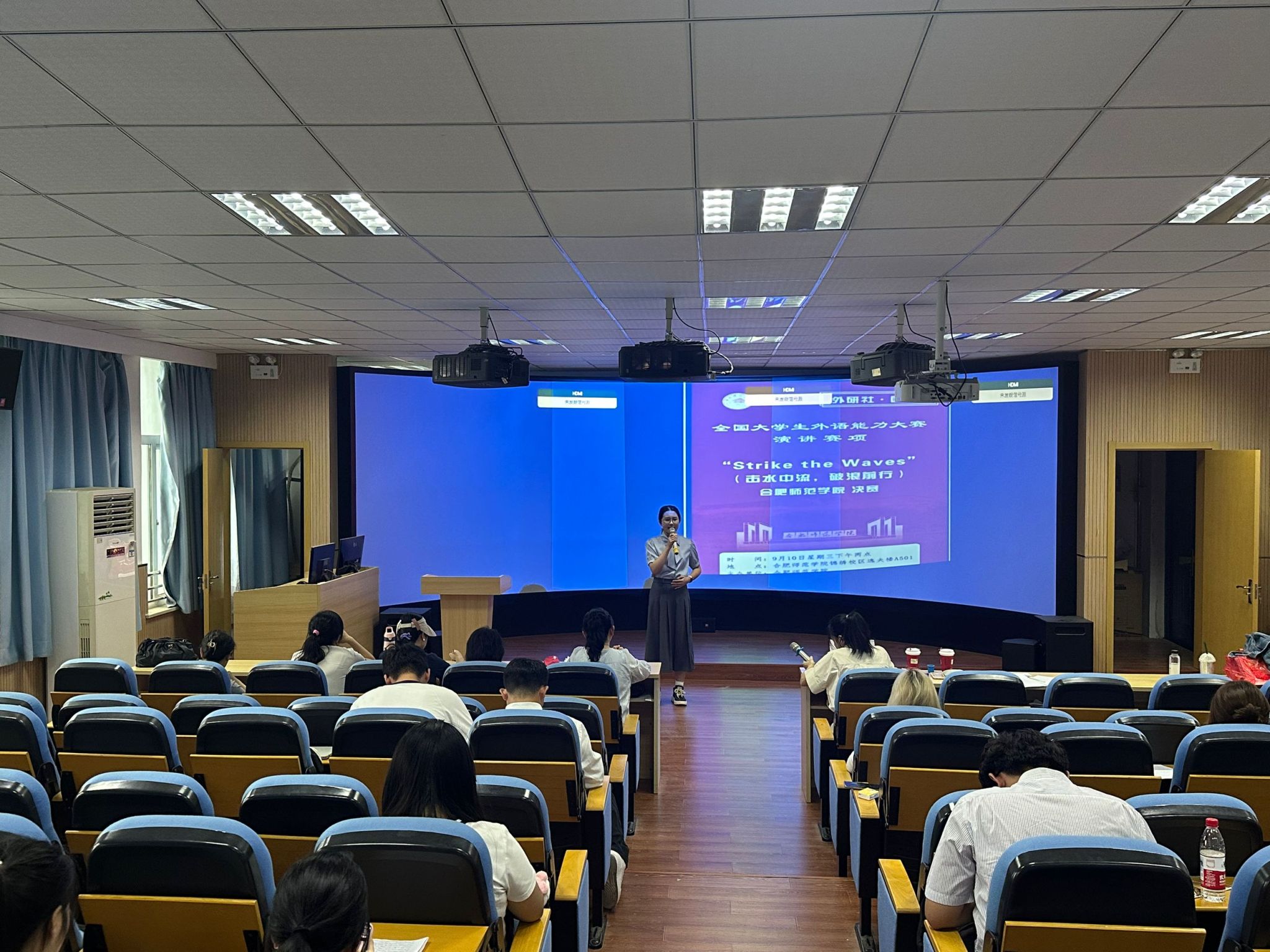 决赛现场,选手们围绕主题“Strike the Waves”进行定题演讲,即兴问答以及一分钟演讲,以清晰的逻辑、流畅的表达和自信的风貌,充分展现了我校学子优秀的语言应用能力和临场应变水平。外国语学院教师担任评委,从语言质量、内容深度、表达效果等多方面进行综合评价。