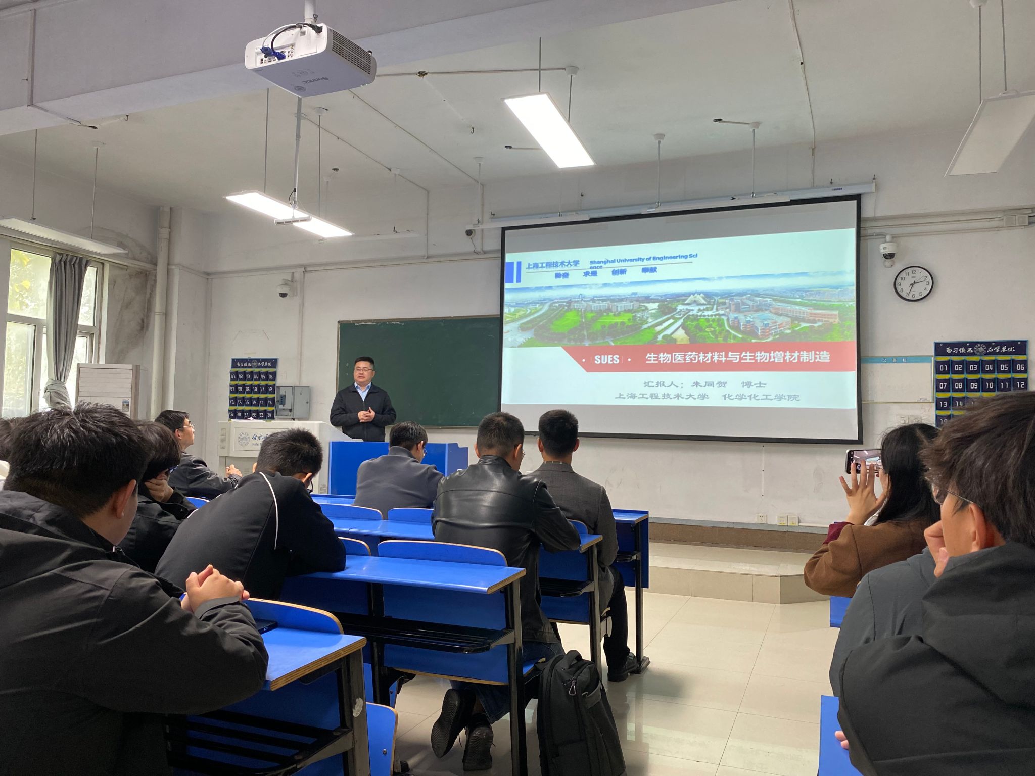 10月31日下午,化学与制药工程学院2012届优秀校友、上海工程技术大学教授朱同贺应邀返回母校,在锦绣校区逸夫楼A103为以化学与制药工程学院师生为主的全校师生作了题为“生物医药材料与生物增材制造”的讲座。讲座由化学与制药工程学院院长朱金苗主持,学院副院长董雄辎、教师代表及相关专业学生参加。
