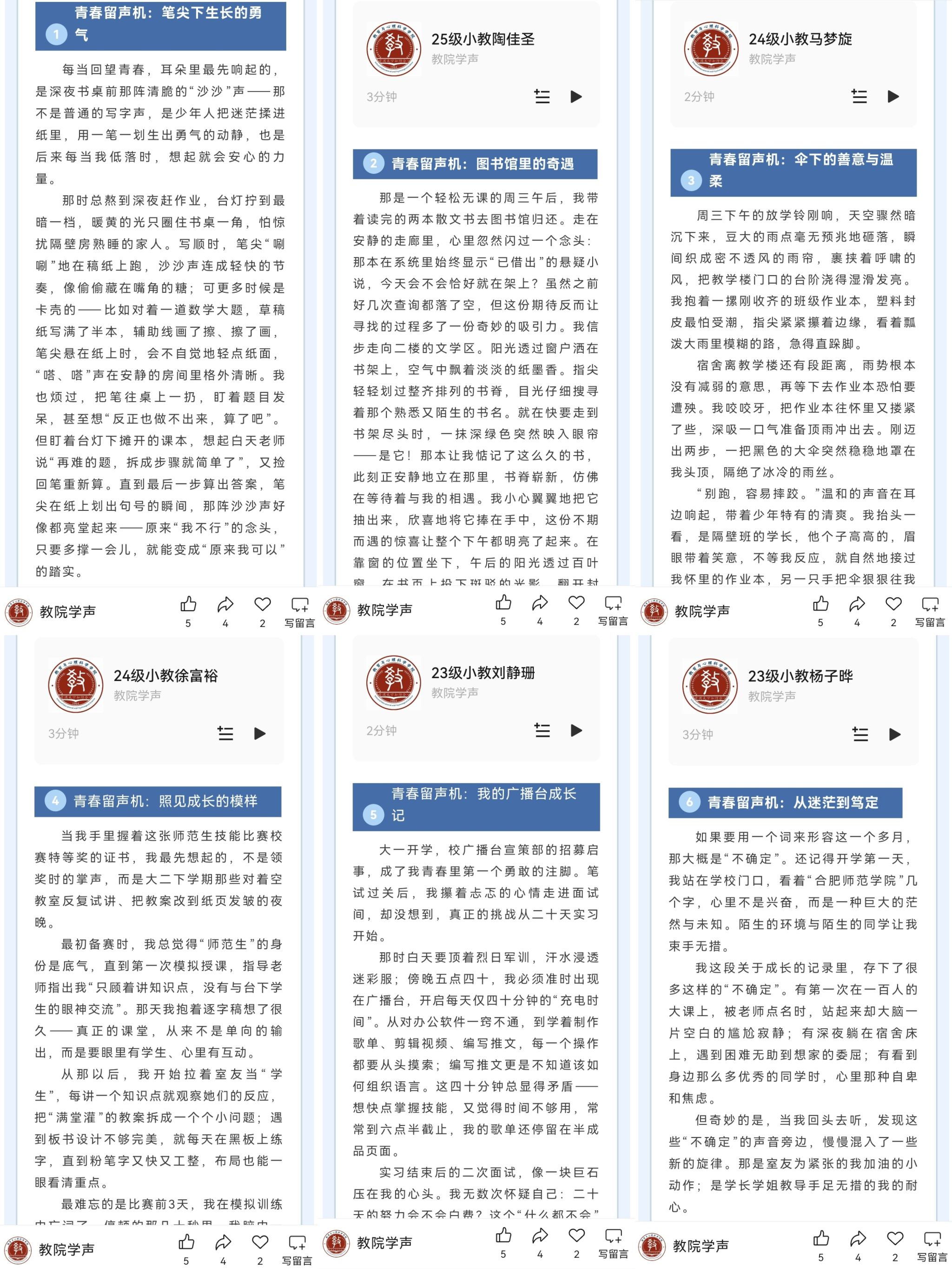 据悉,《青春留声机》是教育与心理科学学院立足一站式学生社区,积极开展的“青春三部曲”系列活动之一,作为一档音频类心理赋能活动,旨在以“同龄人声音”为媒介,通过叙事共鸣实现心理支持,促进学生心理健康良性循环,达到舒缓情绪、自我疗愈的效果,每期的音频将在“教院学声”微信公众号展播。未来,学院计划扩大分享者范围,丰富故事主题,并探索将优质音频资源进行适度推广,让这架“青春留声机”为更多学子的成长之路注入温暖而坚定的精神力量,奏响更为恢弘壮阔的心理育人“共鸣曲”。(教育与心理科学学院 教院学工)