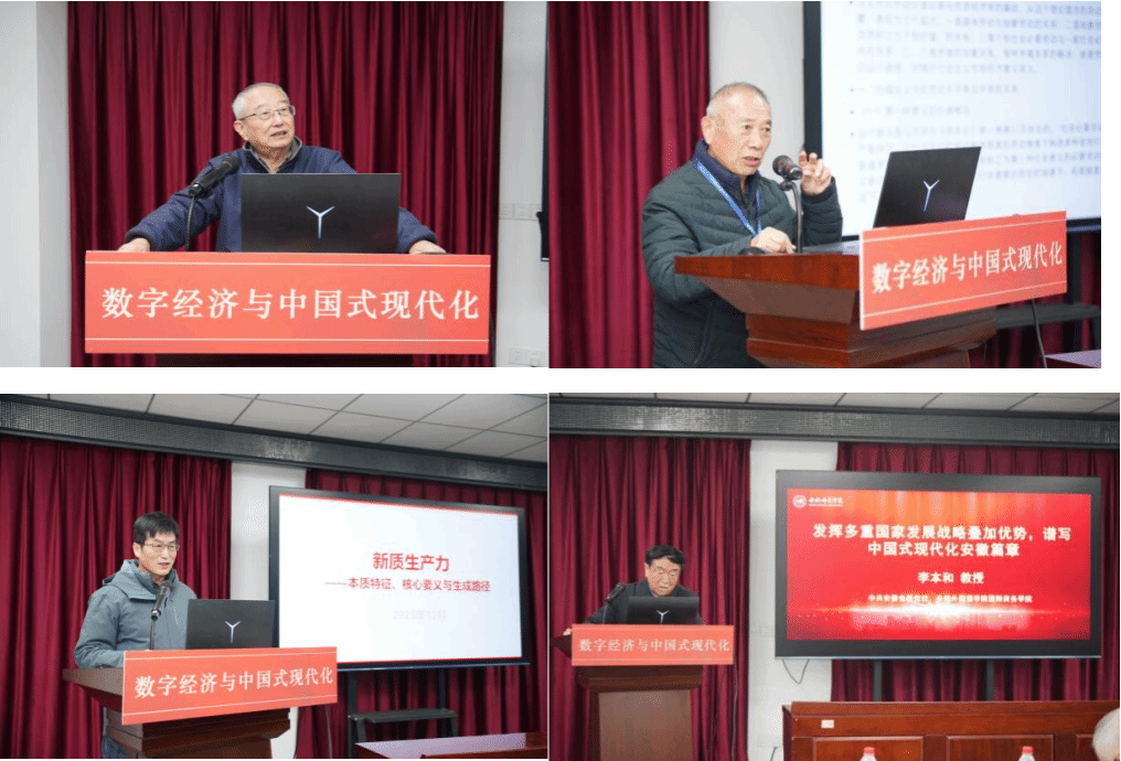 安庆师范大学经济与管理学院汪时珍教授主持主旨报告环节,报告包括:《新质生产力的几个基本理论问题》(安徽大学荣兆梓教授)、《论马克思的价值论蕴含的劳动不平等与平等的矛盾关系》(安徽大学马怀礼教授)、《新质生产力——本质特征、核心要义与生成路径》(安徽财经大学李刚教授)、《智能决策方法及其应用》(安徽师范大学刘树利教授)、《发挥多重国家发展战略叠加优势,谱写中国式现代化安徽篇章》(安徽省委党校李本和教授)、《毛泽东政治经济学方法论的闪光点》(淮北师范大学张作云教授)、《社会主义的技术创新——基于<资本论>的规范研究》(beat365唯一官方网站副校长周端明教授)。