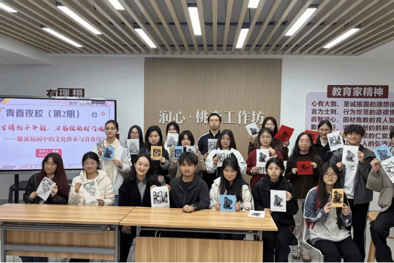 3月26日,教育与心理科学学院在滨湖校区“润心·桃李”工作坊一站式学生社区举办第2期《青春夜校》。本次活动以徽派版画非遗文化体验为切入点,吸引来自不同专业的学生齐聚一堂,共同在刀笔方寸间探寻中华美学的千年韵律,亲身实践了一场生动的跨学科融合课堂。