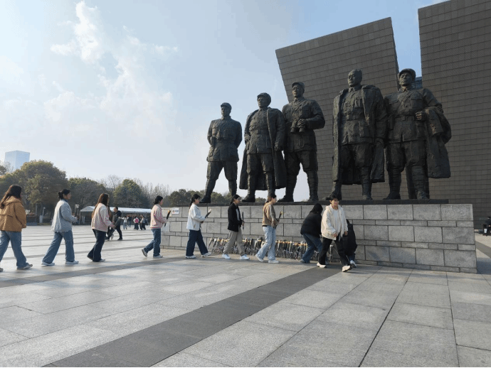 参观结束后,学生们怀着崇敬的心情来到渡江战役总前委雕塑前。在老师的带领下,整齐列队,向革命先烈敬献鲜花、鞠躬致敬,深切表达对英雄先辈们的无限追思与崇高敬意。大家在缅怀中感悟“坚定信念、革命到底,军民团结、奋勇争先,攻坚克难、勇于牺牲”的渡江精神,从中汲取奋进力量。