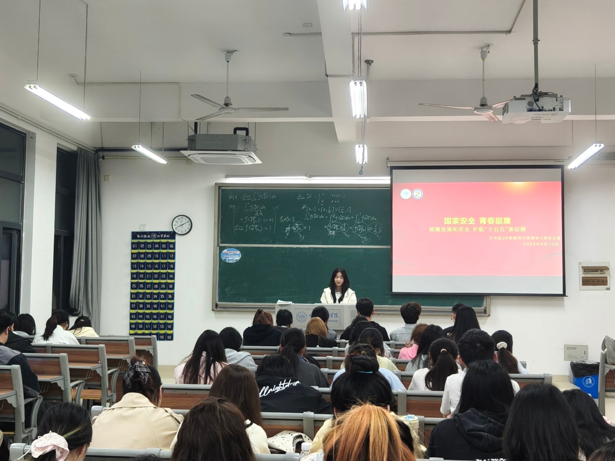 活动在庄严而热烈的氛围中进入尾声——“青春承诺”环节。同学们依次走上讲台,拿起粉笔,在黑板上郑重写下自己简洁有力、发自内心的国家安全守护承诺。“以青春之名,护国安之宁”“国家安全无小事,青年担当正当时”……一句句铿锵的誓言,不仅承载着每一位同学沉甸甸的责任感,更凝聚成新时代青年守护国家安全的集体宣言与承诺。