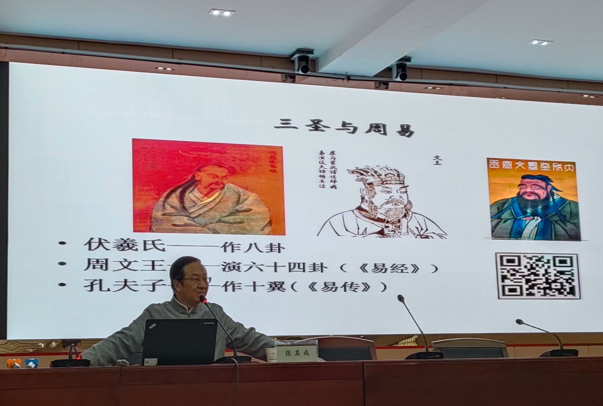 讲座中,张教授从《易经》的起源、发展、基本概念入手,解析了中华传统文化“一源三流、两支五经“的基本结构。一个源头是指《易经》,“三流”是指孔子明解《易经》开创的儒家、老子暗解《易经》开创的道家,以及西汉末年佛教传入中国后与《易经》为代表的中国文化相结合而形成的中国化的佛家。“两支”是指两个支撑点,也即在当代社会最能代表中华传统文化的两大学科:国医和国艺。“五经”则指中华第一经典《易经》、儒家第一经典《论语》、道家第一经典《道德经》、中国化佛教第一经典《六祖坛经》、中医第一经典《黄帝内经》。他将中华文化可以归纳为“易道主干,三教合易”“易魂佛心,儒风道骨”。在此基础上,他揭示了《周易》的当代价值,即涵养社会主义核心价值观的重要源泉;蕴含全人类共同价值,促进人类和平发展;把握事物变化规律,学会趋吉避凶方法;修炼美好精神气质,提升自我幸福感。