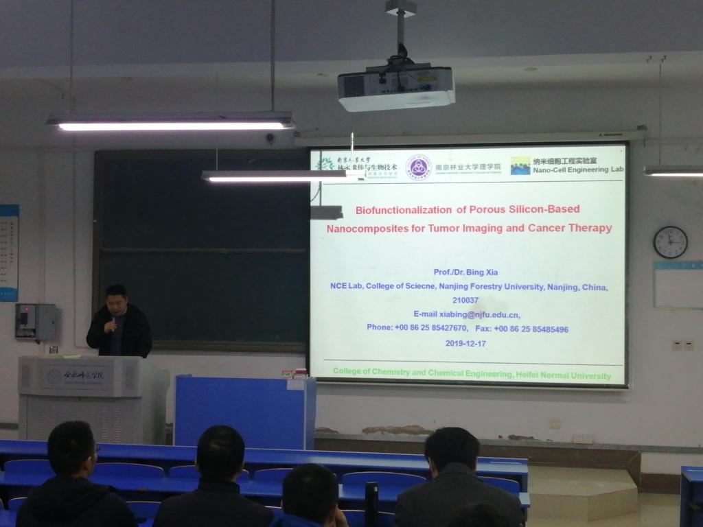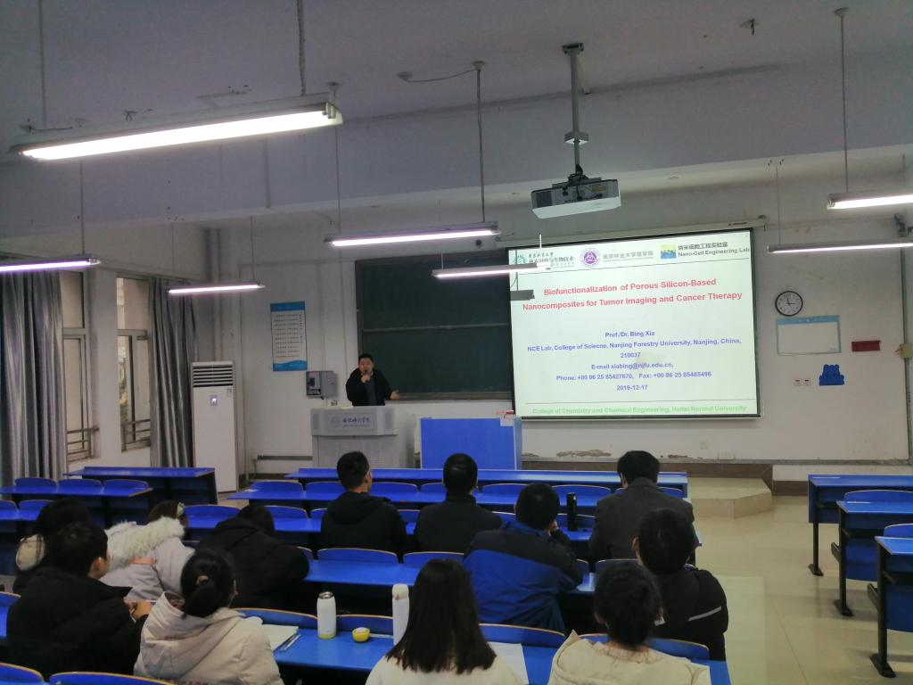 本网讯 12月17日下午,南京农业大学夏兵教授应邀到化学与化学工程学院,作题为“多孔硅纳米复合物的生物功能化及其在肿瘤成像和癌症治疗中的应用”的学术报告,化学与化学工程学院院长董华泽主持了报告会,学院老师和学生参加了报告会。