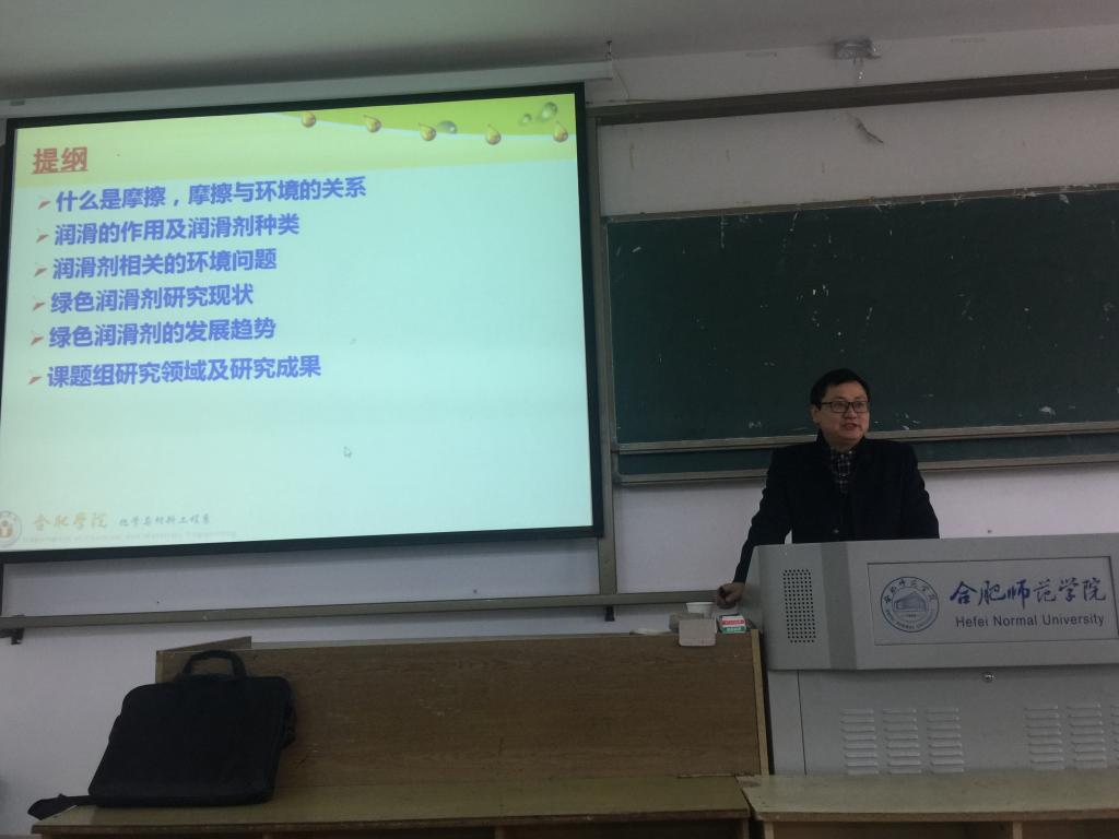 3月6日下午4:00,合肥学院化学与材料工程系胡坤宏教授应邀在锦绣校区博约楼214教室为化学与化学工程学院师生作了题为“绿色润滑剂的研究现状与发展趋势”的学术报告。化学与化学工程学院部分骨干教师和学生等近200人聆听了学术报告。