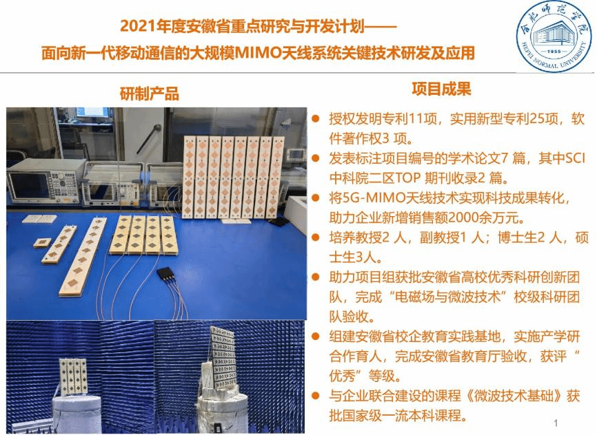该项目通过优化MIMO天线系统关键技术,开发了适用于新一代移动通信频段的双极化单元微带天线、1*4阵列天线、1*8阵列天线、4*4阵列MIMO天线、8*8阵列MIMO天线等系列产品,实现了MIMO天线系统双极化、高增益、可重构的性能,降低了MIMO天线系统硬件复杂度。项目授权发明专利11项,实用新型专利25项,软件著作权3项;发表标注项目编号的学术论文7篇,其中SCI中国科学院二区TOP期刊收录2篇。系列产品经安徽省电子产品监督检测所检测,均符合合同技术指标,已在省内外电子、通信企业中实现推广应用,取得了良好的经济效益和社会效益。该项目的顺利结题验收,标志着我院高水平科研项目结题质量稳步提升。科研处将继续加强科研项目过程服务,以项目为抓手,助推高水平科研成果产出,推进我院科学研究高质量发展。