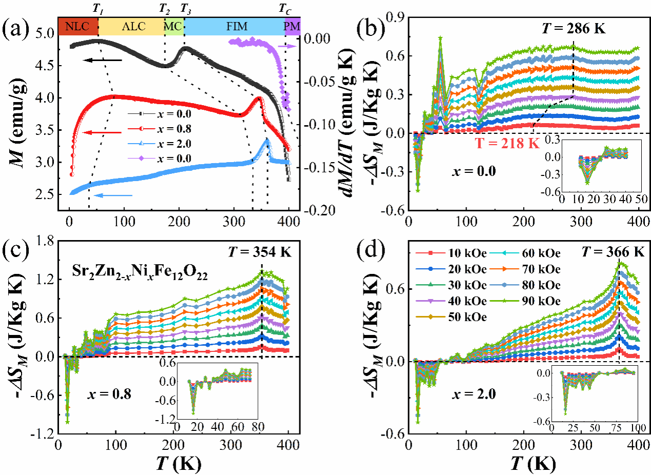本论文发现并报道的Ni离子掺杂的Y型六角铁氧体Sr2Zn2-xNixFe12O22系列材料,在极宽的工作温区(10-400K)同时存在符号相反的变磁场磁熵变(磁热效应)。在近室温区,随着Ni离子的掺杂浓度的增大,Sr2Zn2-xNixFe12O22的传统磁熵变(-ΔSM>0)随温度变化的曲线逐渐从“平台形”转变为“尖峰形”,“平台形”磁热效应可用于埃里克森磁制冷循环。而在低温区(T<100K),Sr2Zn2-xNixFe12O22存在突出的正值磁熵变(-ΔSM<0),此实验现象可解决磁制冷过程中的散热难题。本论文研究结果表明,Ni离子掺杂的Y型六角铁氧体Sr2Zn2-xNixFe12O22材料在宽温域、埃里克森磁制冷循环、磁制冷过程散热中均具备良好的工作性能,是一种具有极大应用前景的多功能磁制冷材料。