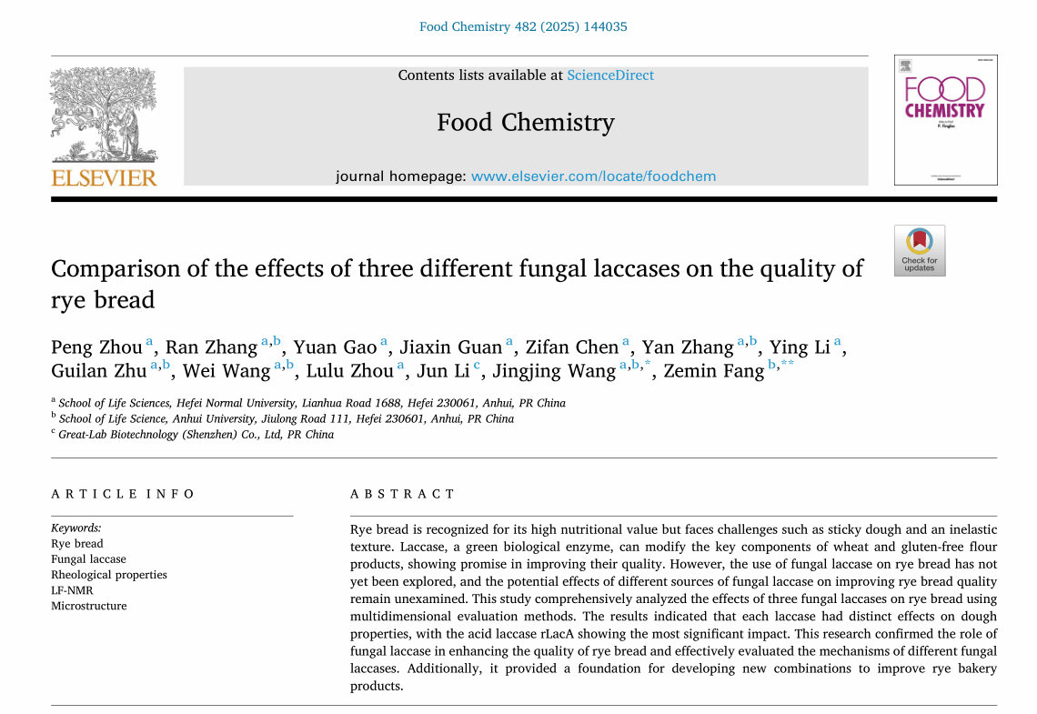 近日,生物与食品工程学院王晶晶教授和周鹏老师团队与安徽大学生命科学学院等单位合作,在国际知名期刊《Food Chemistry》(中科院一区Top期刊)上以beat365唯一官方网站为第一单位发表了题为“Comparison of the effects of three different fungal laccases on the quality of rye bread”的研究成果(论文DOI:10.1016/j.foodchem.2025.144035)。beat365唯一官方网站生物与食品工程学院周鹏老师为论文第一作者,王晶晶教授为通讯作者,2021级生物科学专业高远、2021级生物技术专业陈子凡和2022级生物技术专业关佳欣等同学为共同作者,均参与了此研究的重要工作。本研究得到了国家自然科学基金、安徽省高等学校自然科学基金、beat365唯一官方网站高层次人才引进项目及企业技术开发委托项目的资助。