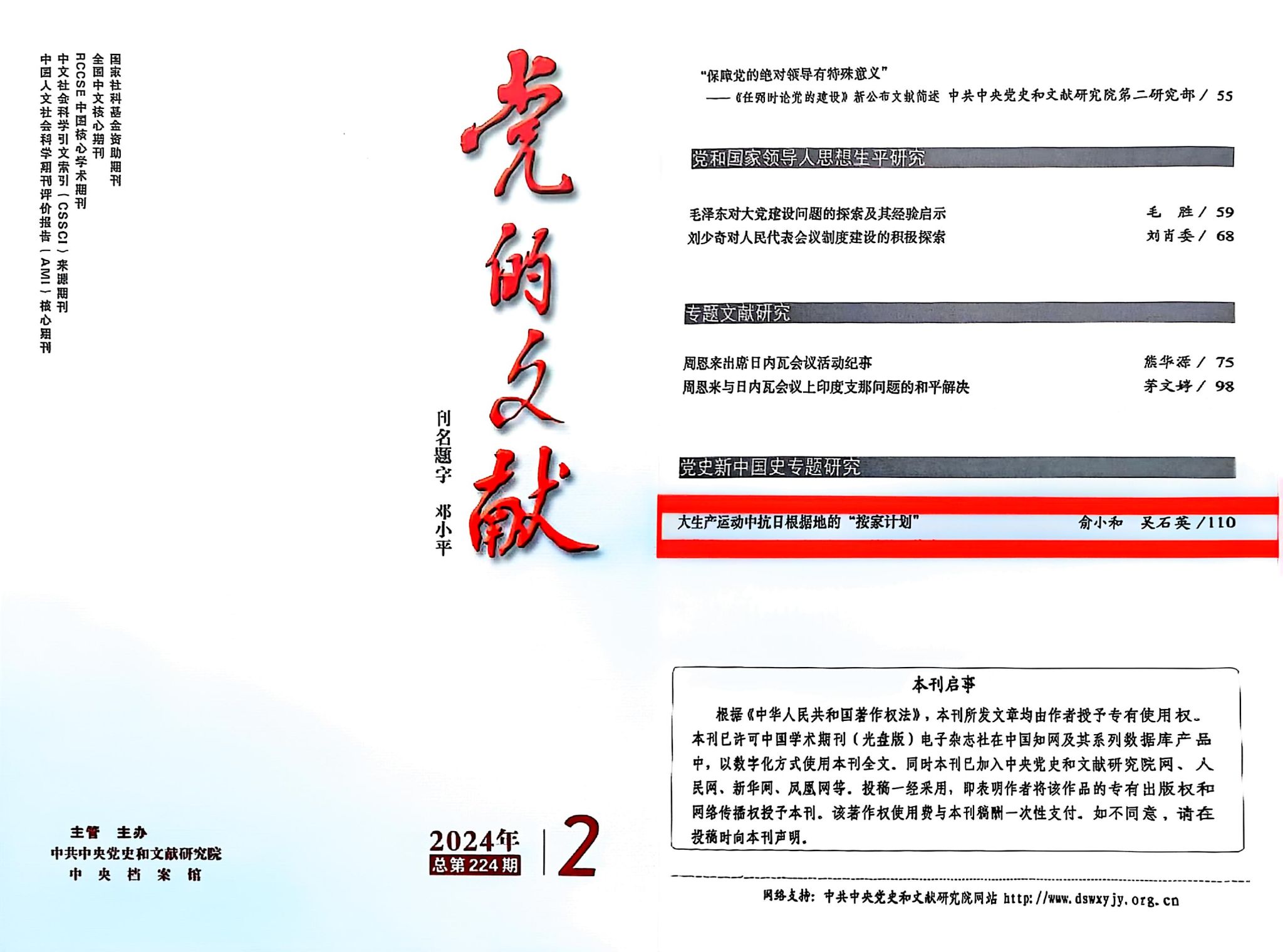 1941年后,为克服经济困难,中国共产党领导军民在敌后抗日根据地掀起了轰轰烈烈的大生产运动,除了宣传号召,榜样示范以外,党是如何领导群众生产的?有没有可操作性的具体政策?马院教师俞小和、吴石英对此进行了深入研究,相关成果发表在《党的文献》2024年第2期上,该刊由中央党史和文献研究院主办,属于CSSCI来源期刊,AMI评价A刊核心。论文题目为:大生产运动中抗日根据地的“按家计划”。