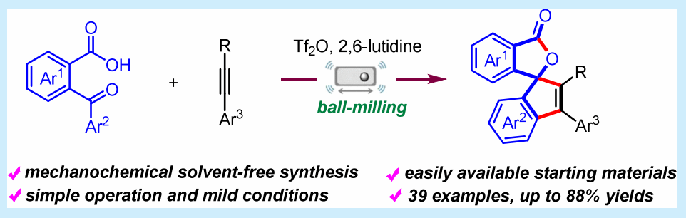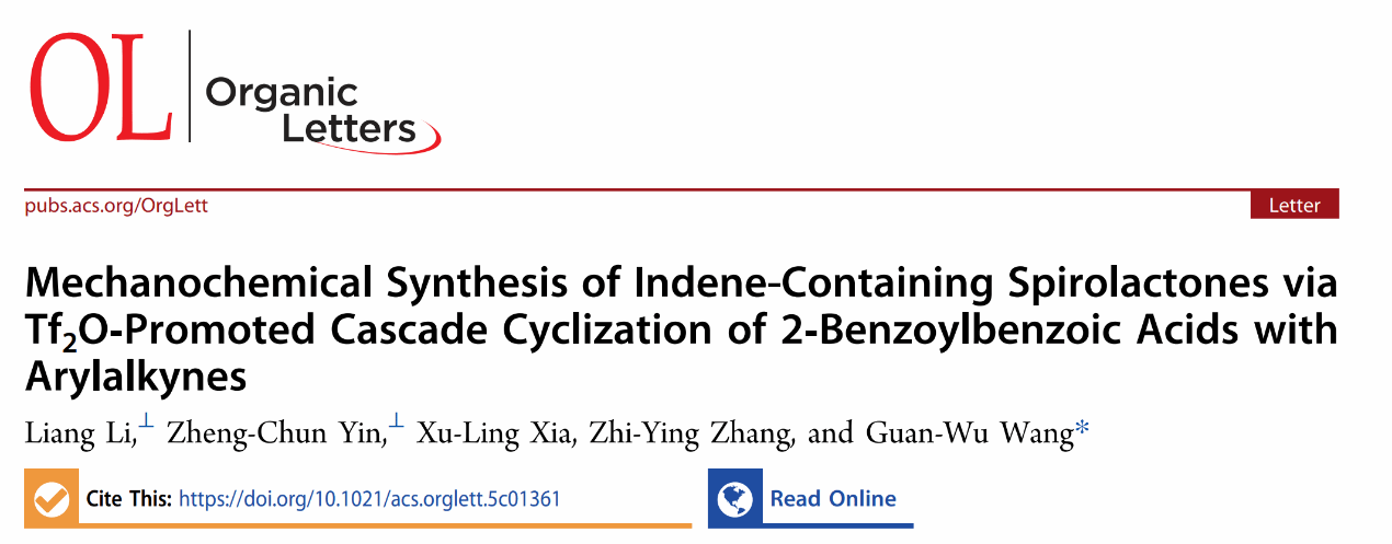 近期相关成果以“Mechanochemical Synthesis of Indene-Containing Spirolactones via Tf2O‑Promoted Cascade Cyclization of 2‑Benzoylbenzoic Acids with Arylalkynes”为题发表在《Organic Letter》期刊上,该期刊为中国科学院SCI一区TOP期刊,影响因子为4.9。beat365唯一官方网站为第一单位,化学与制药工程学院李亮老师为第一作者。