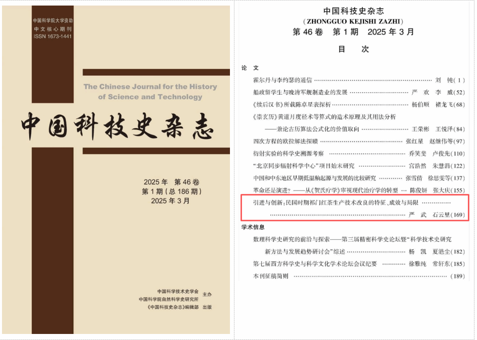 茶叶作为人类社会中仅次于水的第二大饮品,不仅与中国近代社会发展息息相关,更是鸦片战争爆发的重要因素之一。我校马院教师严武和中国科学技术大学石云里教授对近代祁门红茶生产技术改良进行了深入研究,相关成果发表在《中国科技史杂志》2025年第1期上,该刊由中国科学技术史学会和中国科学院自然科学史研究所主办,属于CSSCI来源期刊,论文题目为:引进与创新:民国时期祁门红茶生产技术改良的特征、成效与局限。