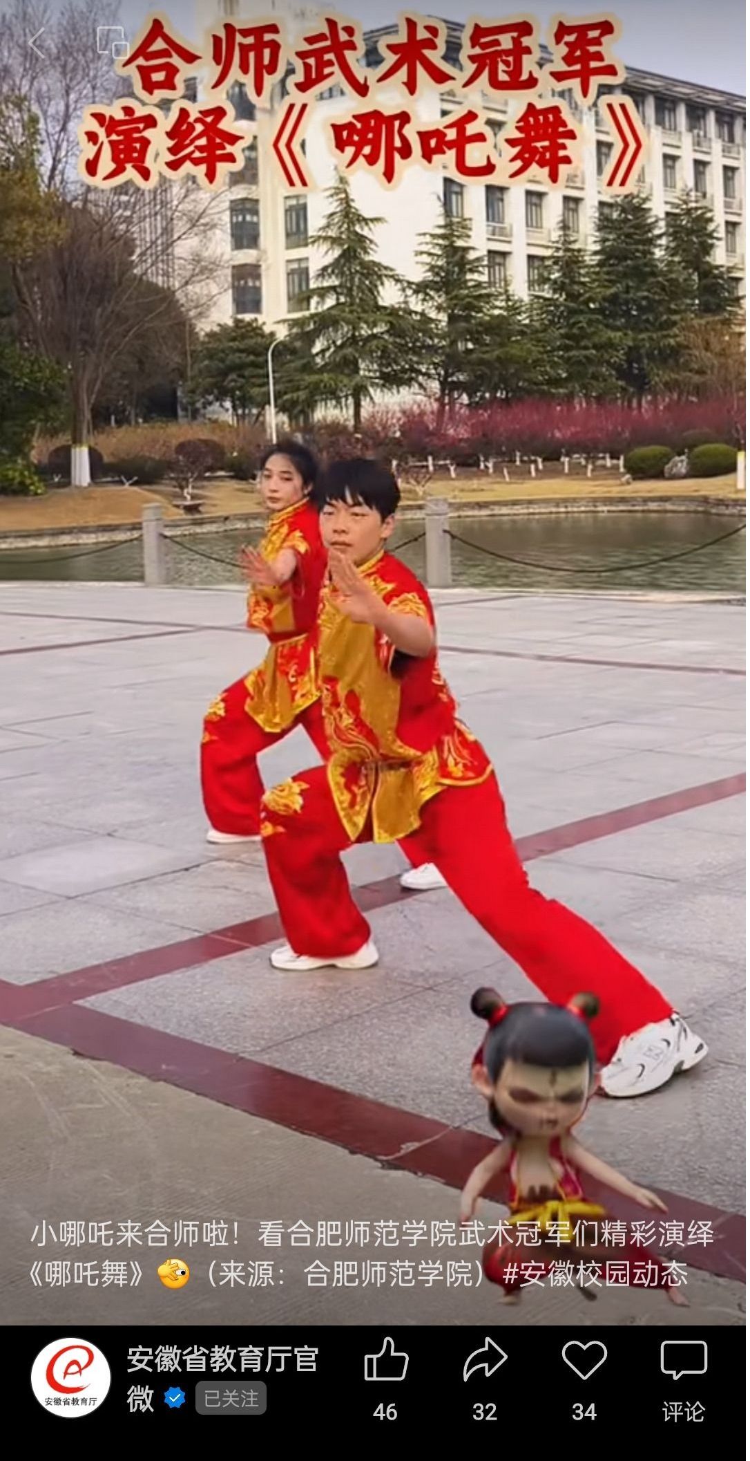 【安徽省教育厅官微】安徽省教育厅官微视频号发布我校武术冠军演绎哪吒舞视频