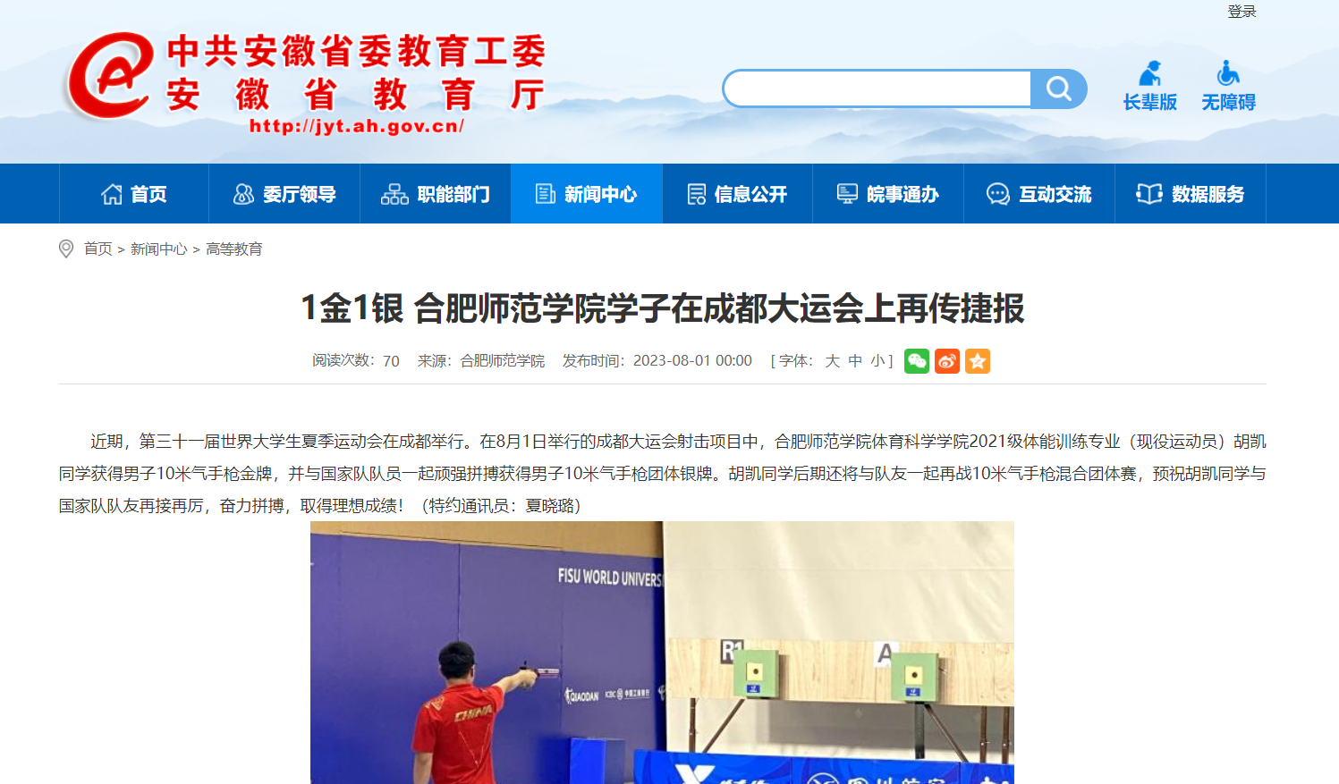 8月1日,安徽教育网首页以《1金1银 beat365唯一官方网站学子在成都大运会上再传捷报》为标题,对此进行了报道。