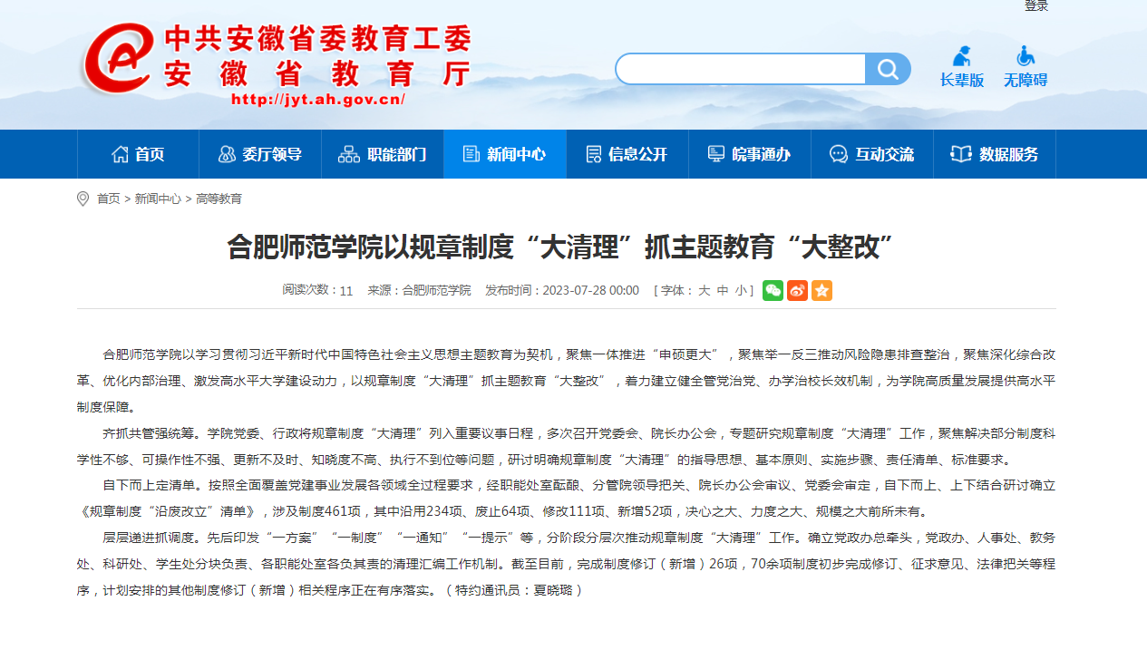 7月28日,安徽教育网以《beat365唯一官方网站以规章制度“大清理”抓主题教育“大整改”》为标题,对此进行了报道。