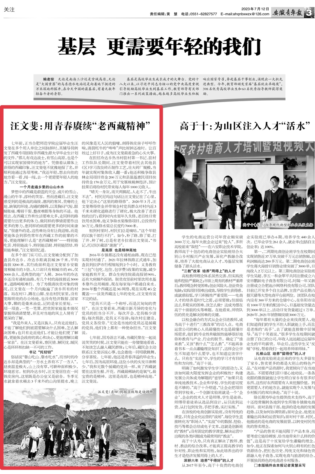 7月12日,《安徽青年报》(第2231期)以《汪文斐:用青春赓续老西藏精神》为题,对我院毕业生汪文斐进行了报道。