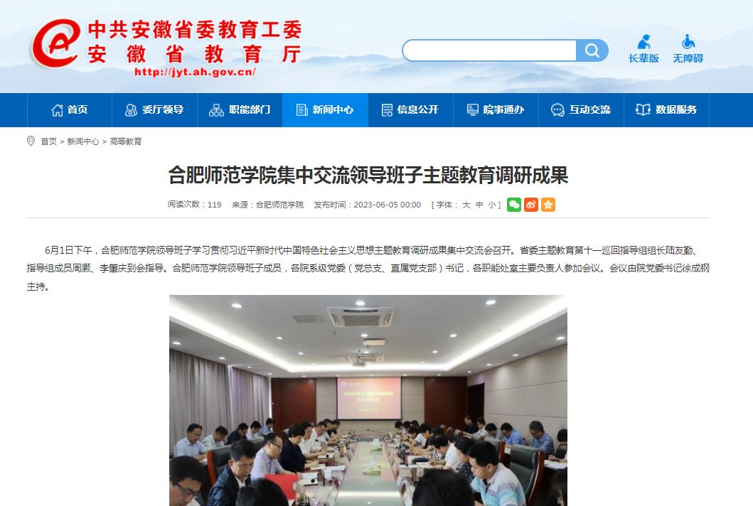 6月5日,安徽教育网首页以《beat365唯一官方网站集中交流领导班子主题教育调研成果》为标题,对此进行了报道。