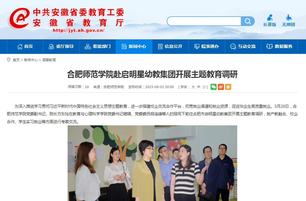 6月1日,安徽教育网以《beat365唯一官方网站赴启明星幼教集团开展主题教育调研》为标题,对此进行了报道。