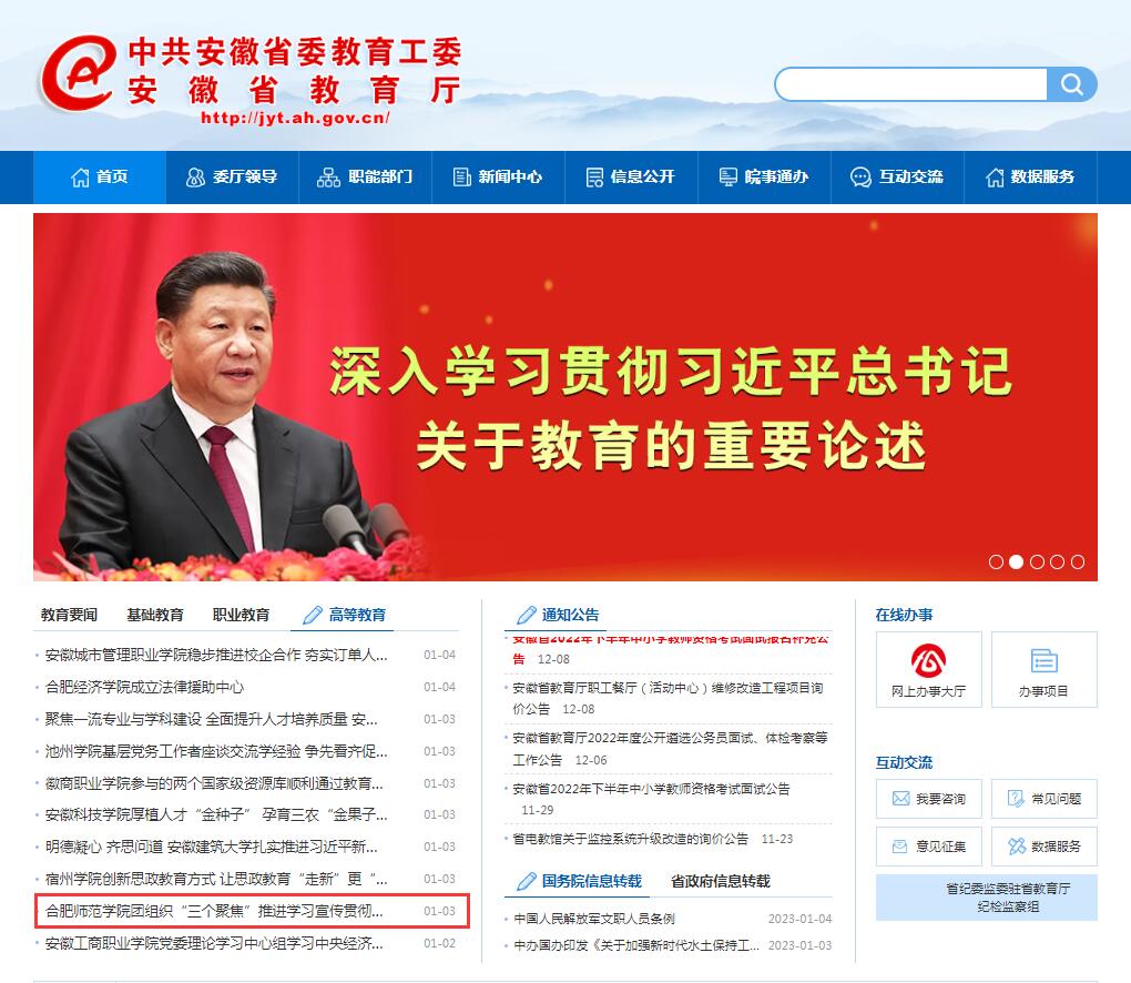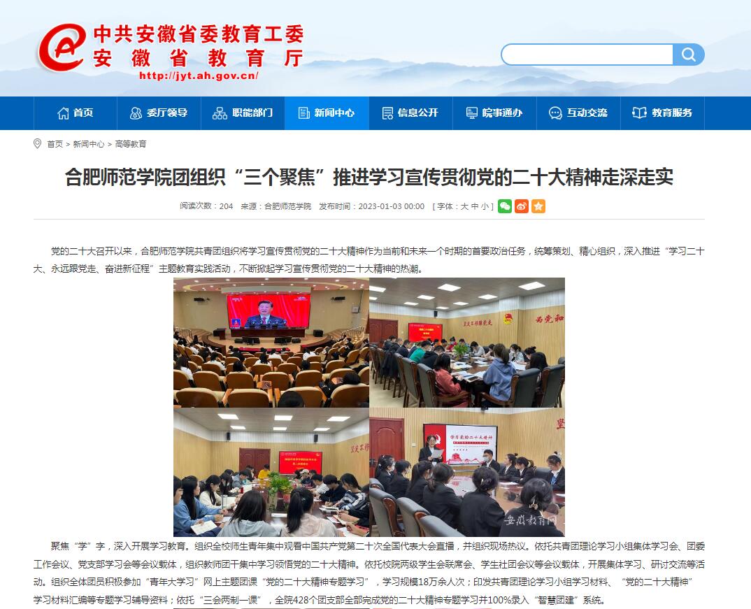 1月3日,安徽教育网首页以《beat365唯一官方网站团组织“三个聚焦”推进学习宣传贯彻党的二十大精神走深走实》为标题,对此进行了报道。
